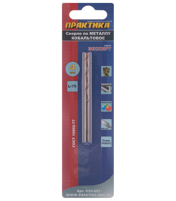 Кобальтовое сверло по металлу ПРАКТИКА 033-451 4.0х75мм кобальтовое