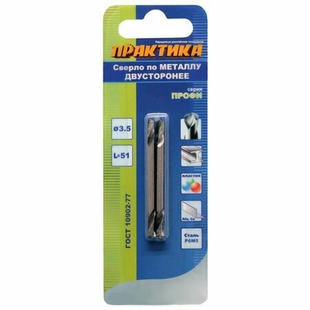 Сверло по металлу двустороннее ПРАКТИКА Р6М5 3,5 х 51 мм (2шт.) блистер-полностью шлифованное двустороннее сверло по металлу, изготовлено из стали Р6М5. Угол заточки острия сверла 118 градусов, подходит для обработки металлов с пределом прочности до 900 Н/мм. При сверлении рекомендуется использовать смазочно-охлаждающую жидкость. Сверло поставляется в индивидуальной упаковке блистере, в упаковке 1 штука.