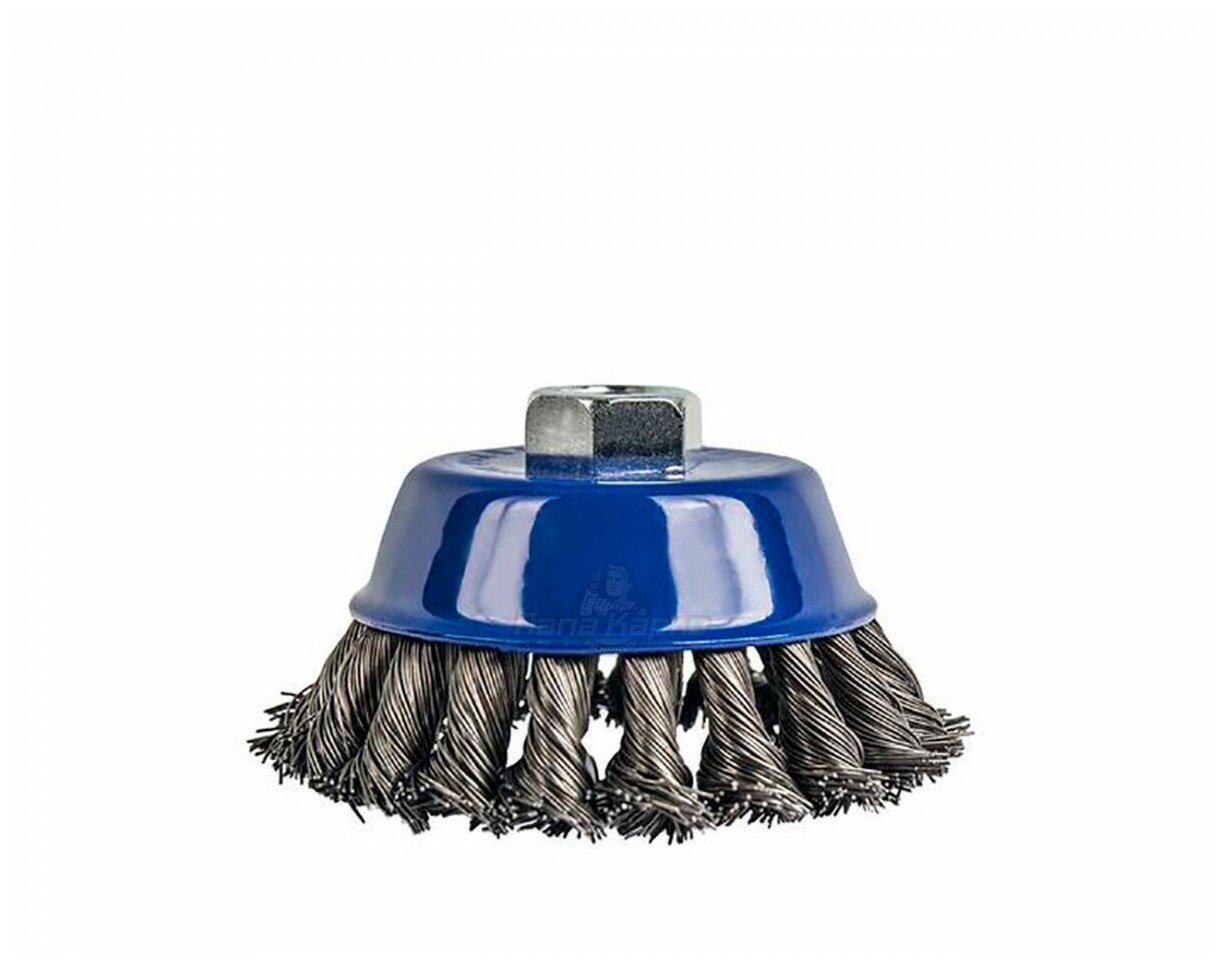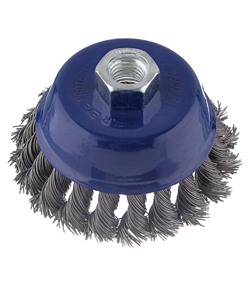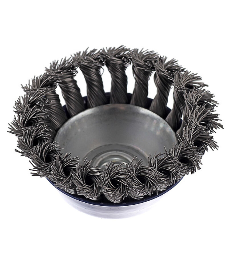 Серия "Мастер". Кордщетка для угловых шлифмашин. Резьбовая посадка на шпиндель. Витая стальная проволока. Для грубой обработки дерева, снятия краски, шлифовки толстого металла, снятия ржавчины, окалины, обработки сварных швов.