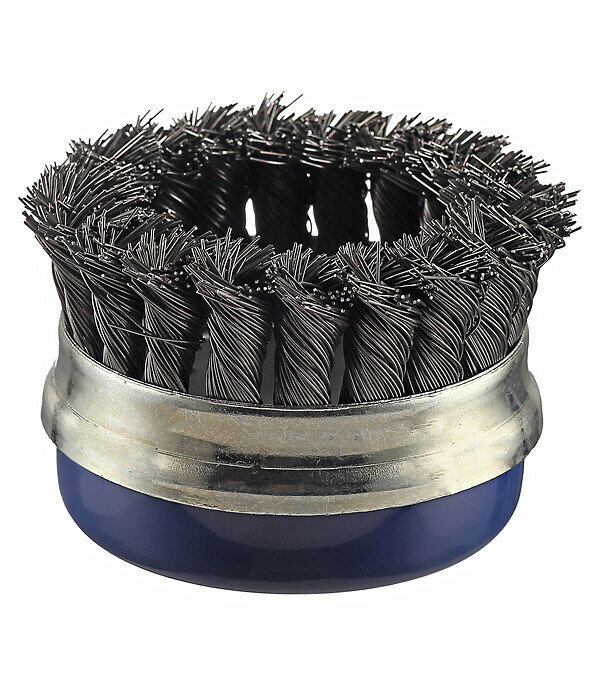 Чашеобразная витая кордщетка, усиленная стальным кольцом, выпущена российским брендом ПРАКТИКА специально для работы с угловыми шлифовальными машинами. Ее диаметр составляет 75 мм, щетка изготовлена из жесткой стальной проволоки, собранной в жгуты. Снаружи жгуты защищает стальное кольцо, которое не дает им слишком быстро разворачиваться при вращении, тем самым продлевая срок годности инструмента. Насадка предназначена для грубой зачистки металлических и деревянных поверхностей, бетонных полов, шлифовки следов сварки. Кордщетка легко снимает толстые слои краски, лака, ржавчины. Посадочная резьба инструмента на МШУ — М14. Работая со щеткой, рекомендуется защищать кожу рук и лица, глаза. Максимальная скорость вращения составляет 12200 оборотов в минуту.