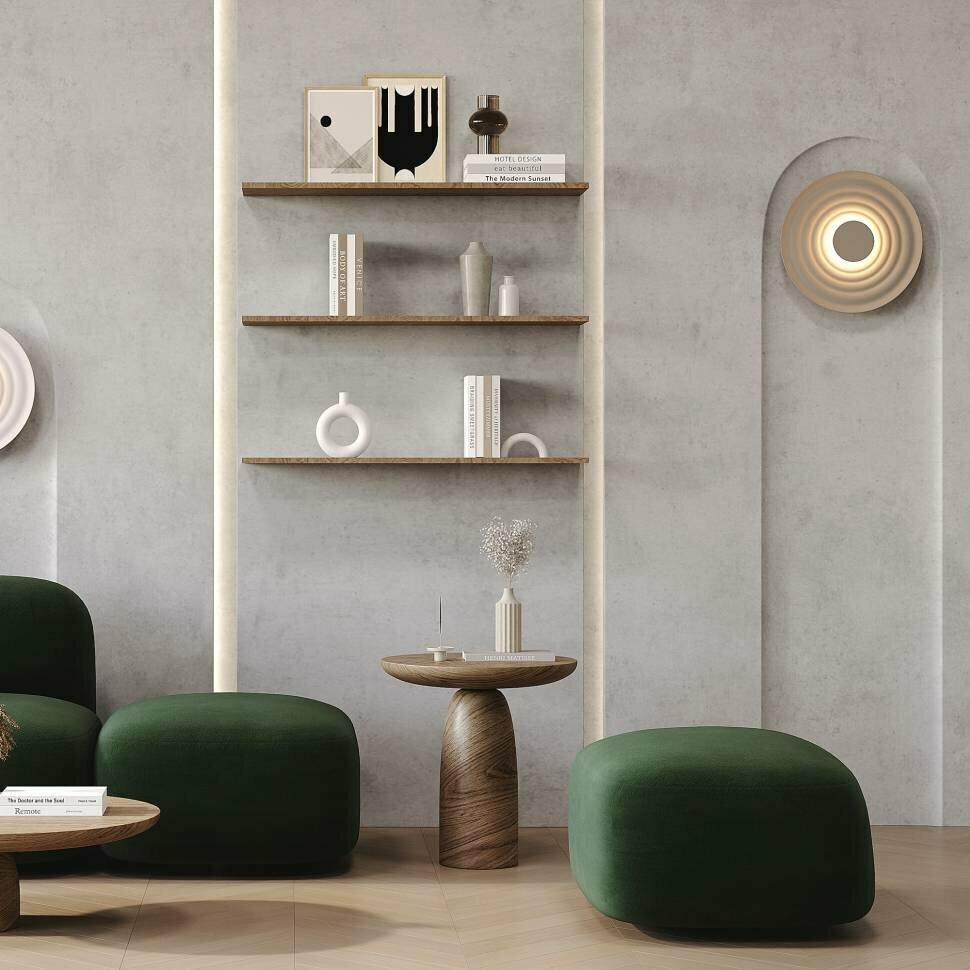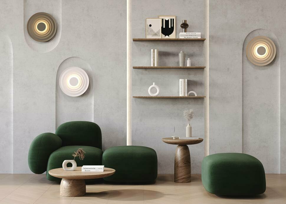 Светильники, вдохновленные японским садом камней и движением ветра. Волнообразные формы с матовой антибликовой поверхностью. Материал арматуры — алюминий. LED-источник света с температурой 3000К. Доступны в трех цветах: белый, серый, хаки. Переотраженный свет для создания мягкого освещения. Возможность составления различных композиций.