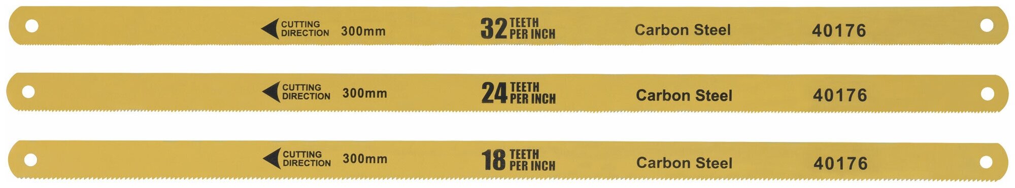 Полотна 300мм для ножовки по металлу (18Т+24Т+32Т), 3 вида по 2шт. Гибкое, калёный зуб. Материал: легированная 20Cr сталь. Упаковка: пластиковый подвес.