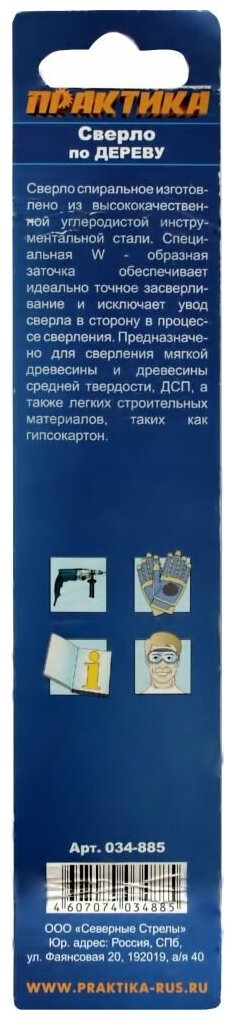 Серия "Мастер". Изготовлено из высококачественной углеродистой инструментальной стали У10А. Для точного сверления мягкой и твердой древесины. Специальная W-образная заточка исключает увод сверла из точки сверления. Шлифованная поверхность тела и спирали обеспечивает высокую скорость сверления и равномерный выход стружки. Допустима перезаточка.