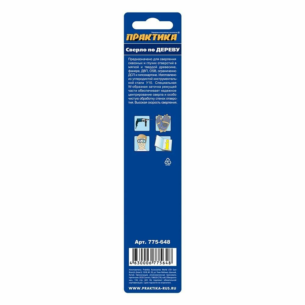 | Прочие особенности и свойства | Изготовлено из высококачественной углеродистой инструментальной стали. Для точного сверления мягкой и твердой древесины, фанеры, ДСП. Специальная W-образная заточка с выраженным центром исключает увод сверла в сторону от точки сверления. Идеально выраженная боковая подрезка обеспечивает ысокую скорость сверления и чистые кромки отверстия. |
