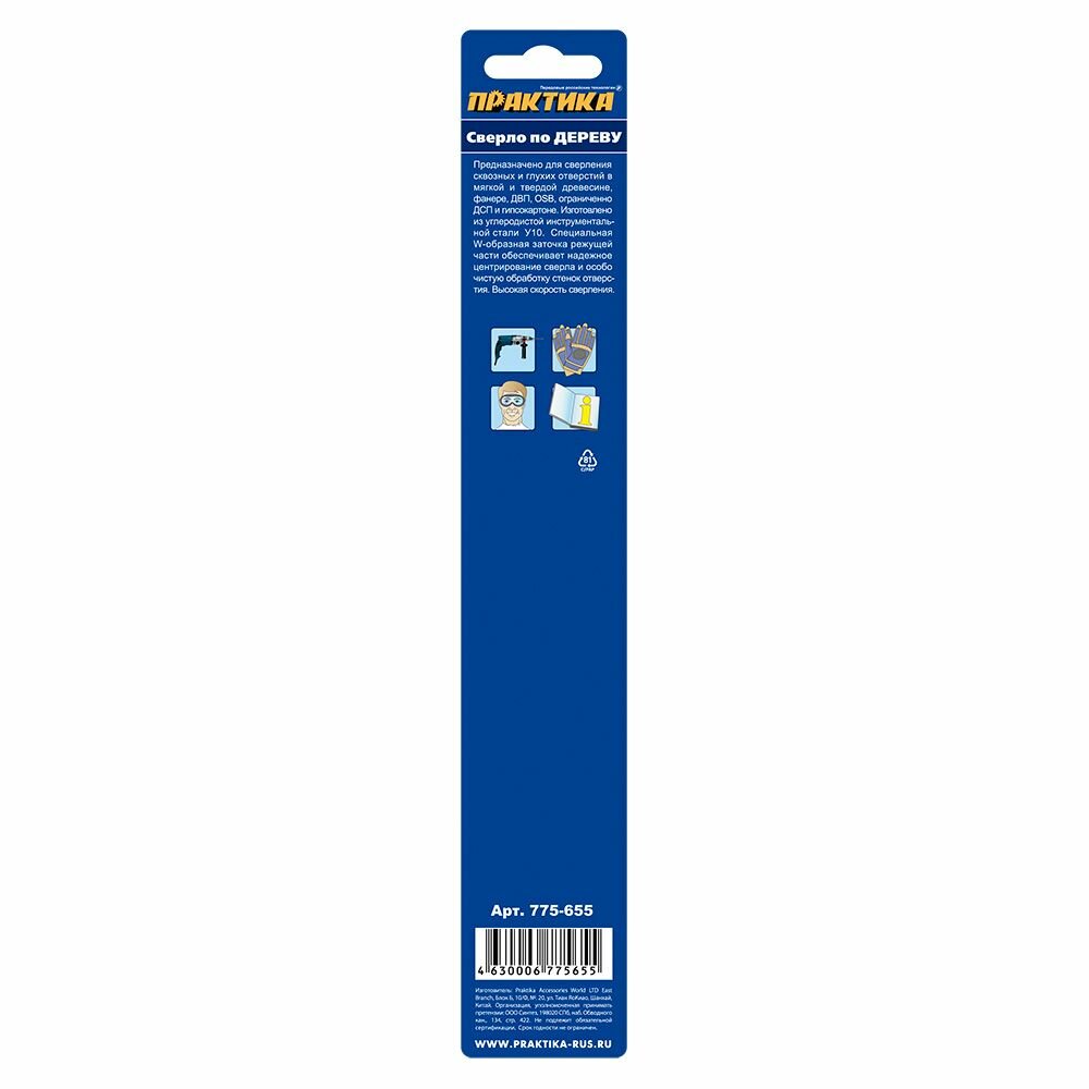 Сверло по дереву от российского производителя «Практика» из серии «Профи» изготовлено из высокоуглеродистой стали высокого качества. Предназначено для сверления отверстий в древесине мягких и твердых сортов, ДСП, фанеры, склеенного дерева. Диаметр модели — 12 мм, длина — 200 мм. Инструмент заточен специальным образом W-образно, его ярко-выраженный центр не дает изделию деформироваться, сместиться в сторону от выбранной точки сверления.