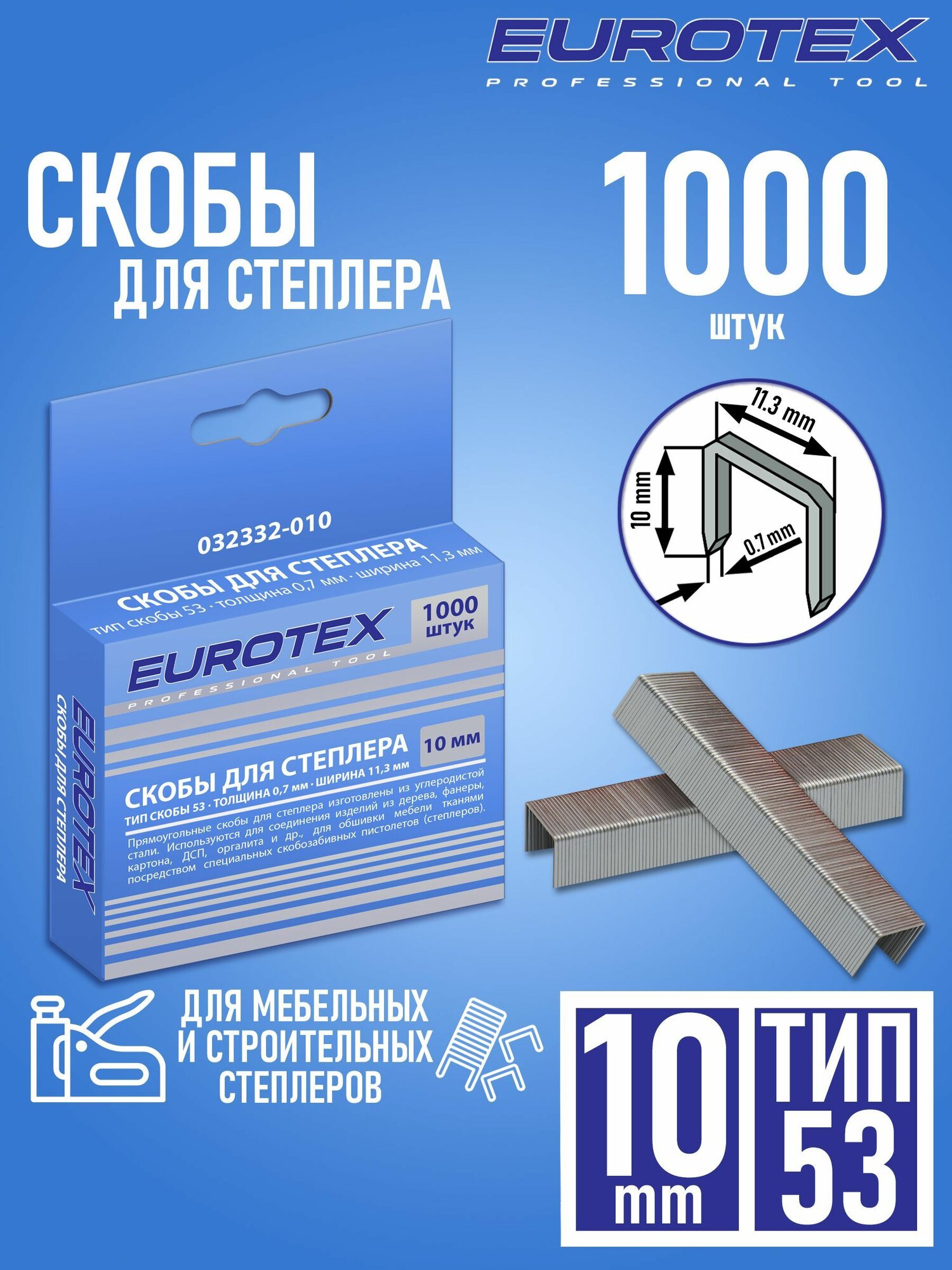 Прямоугольные скобы для степлера изготовлены из углеродистой стали, закалены. Используются для соединения изделий из дерева, фанеры, картона, ДСП, оргалита и др., для обшивки мебели тканями посредством специальных скобозабивных пистолетов (степлеров). Длина скобы: 10 мм, ширина — 11,3 мм, толщина — 0,7 мм. Тип 53. В упаковке 1000 шт.