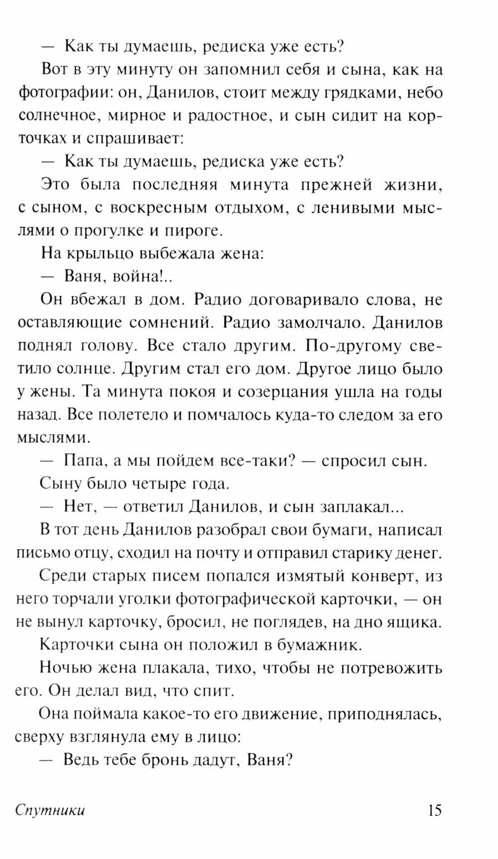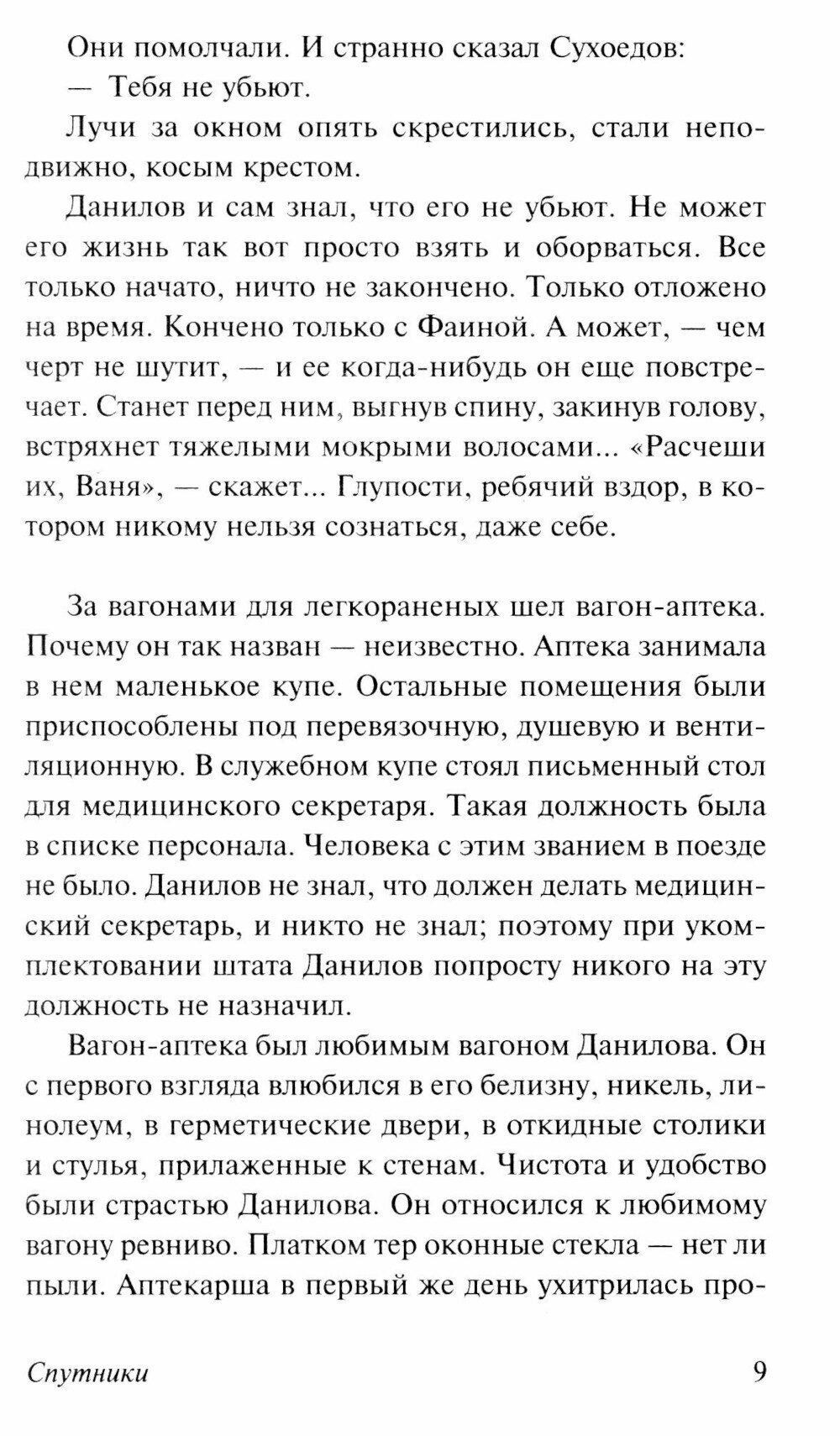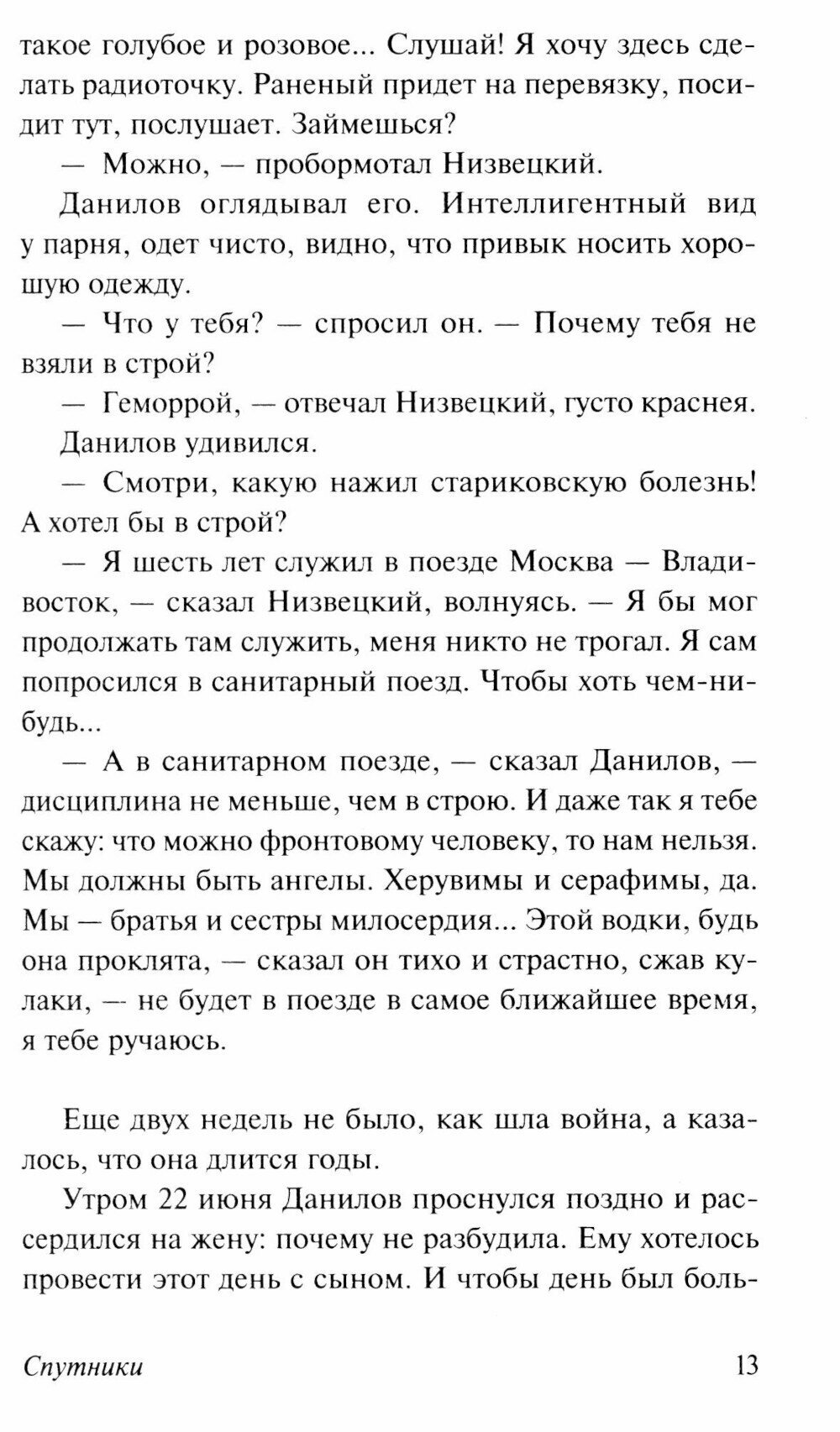 Перед читателем предстают будни санитарного поезда, который с 1941-го по 1945-й вывозил раненых с фронта в тыловые госпитали. Будни абсолютно непохожих людей: молчаливого интеллигента Белова, эгоистичного Супругова, отважной Лены Огородниковой, профессионально холодной Юлии Дмитриевны, доброй Фаины и многих других. Каждый со своей судьбой, своими горестями, слабостями и жизненными принципами. Поезд и долг перед Родиной сделали их спутниками на дорогах войны. Чтобы написать эту книгу, Вера Панова два месяца провела в санитарном поезде, своими глазами увидела важный труд тех, кто хоть и не находился на передовой, но, спасая жизни раненых, внес свой вклад в Победу. «Спутники» дважды экранизировались, это любимые всеми фильмы «Поезд милосердия» Искандера Хамраева и «На всю оставшуюся жизнь» Петра Фоменко.