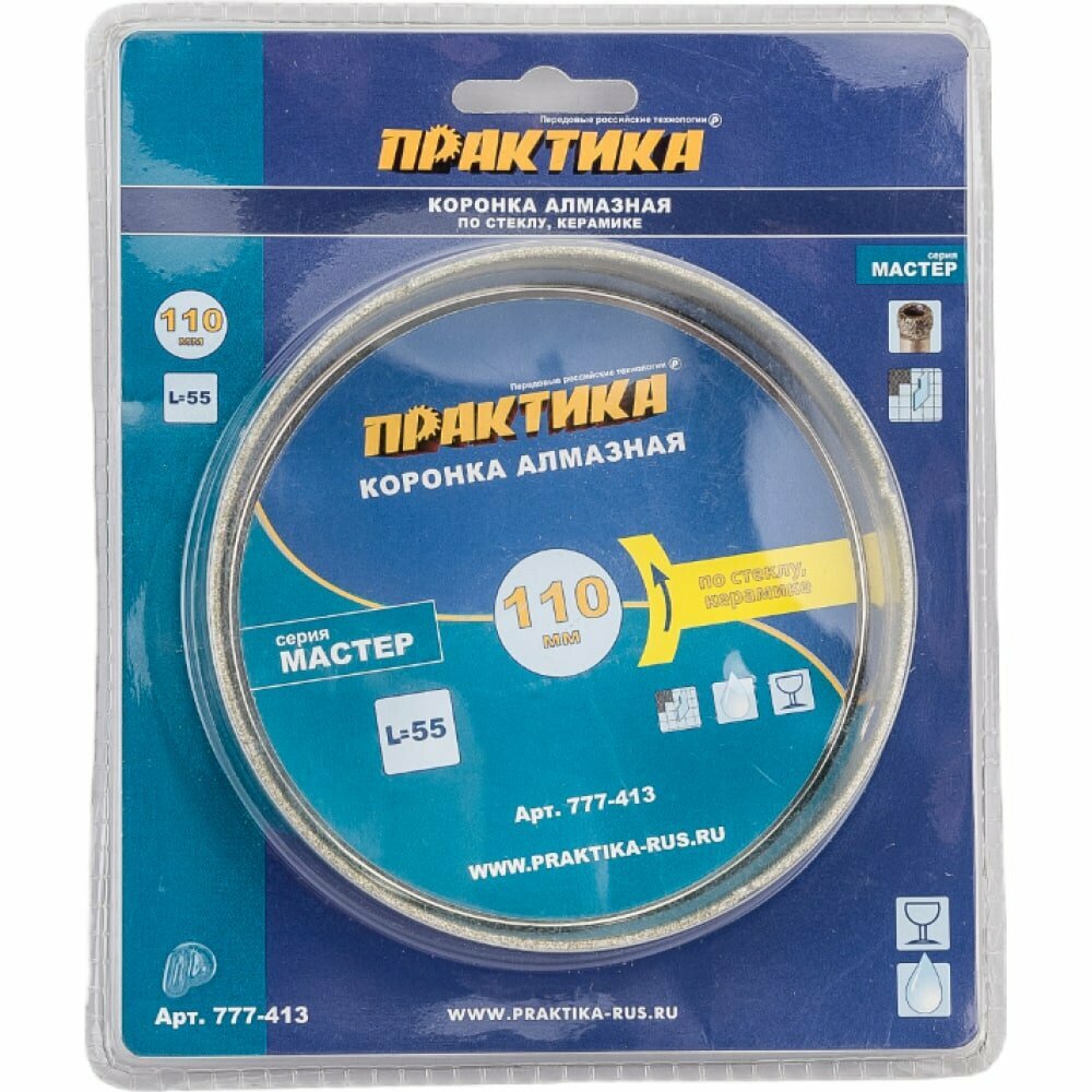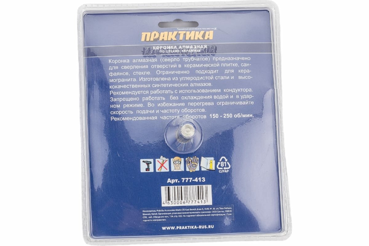 Садовый инструмент Практика 777-413 «ПРАКТИКА» «Мастер» 777-413 - это алмазная коронка, изготовленная из высококачественного материала. Она предназначена для сверления отверстий в стекле и керамике. Рекомендуется работать с помощью направляющего кондуктора (в комплект не входит), а во избежание перегрева коронки, необходимо ограничивать скорость сверления - 150-250 об/мин. Размер коронки составляет - 110 x 55 мм.