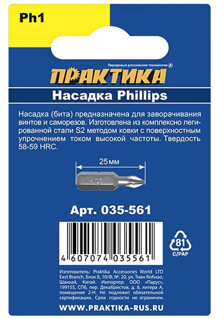 Инструментальная односторонняя насадка-бита Практика 035-561 серии «Профи» крестового стандарта Philips PH1 длиной 25 мм предназначена для широкого использования с ручными и электрическими отвёртками и шуруповёртами. Оснастка изготовлена из высококачественной инструментальной стали повышенной твёрдости и ударной вязкости, что обеспечивает её прочность, выносливость в самых жёстких условиях работы и длительный срок службы
