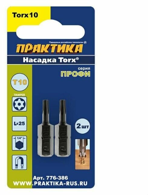 Набор бит отверточных ПРАКТИКА Профи 776-386 Torx Tamper-10х25мм, магнитные, серия "Профи". Благодаря точному звездообразному профилю биты хорошо передают крутящий момент без давления на винт (шуруп), что позволяет оптимально использовать данный тип винтов для ответственных, точных соединений деталей машин, приборов, бытовой техники.