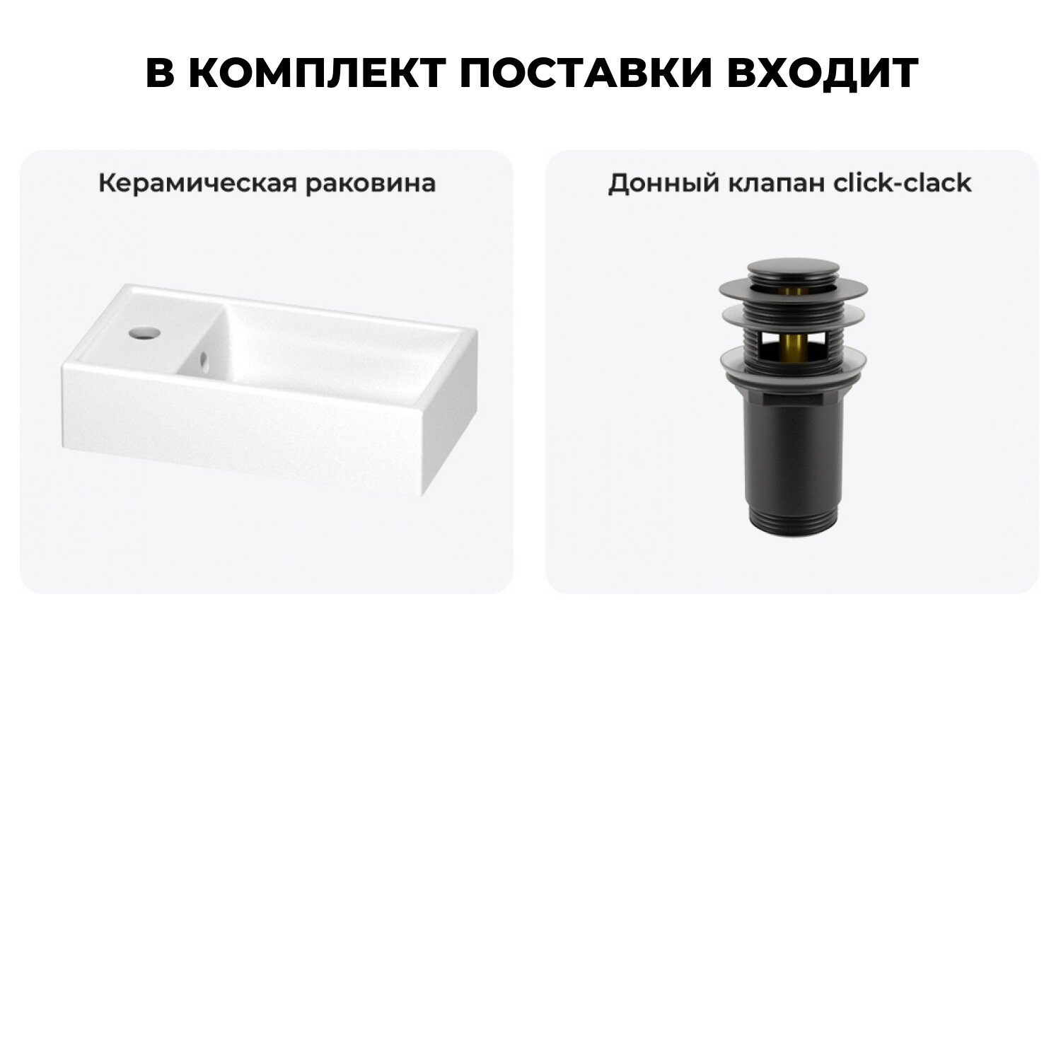 Комплексное предложение по специальной цене от Wellsee. Все составляющие набора проходят деликатные апгрейды для достижения абсолютной гигиены, надежности монтажных элементов и максимального удобства в пользовании.КЕРАМИЧЕСКАЯ РАКОВИНАСтильная мини-раковина Wellsee WC Area, на бортике которой расположено стандартное отверстие под смеситель и остается небольшое место для гигиенических средств, удобна для мытья рук и гигиенических процедур, а ее малый вес существенно облегчает монтаж. Компактные размеры модели станут оптимальным решением для помещений с ограниченным пространством и туалетных комнат.Раковины Wellsee производятся по технологии шликерного литья с использованием натуральной глины и кварца и последующим обжигом заготовки при температуре 1250°С, что исключает образование пузырьков, пустот или трещин в готовом изделии, а также гарантирует соблюдение заданных размеров чаши. В результате формируется плотная структура, которая придает умывальнику дополнительную прочность даже в наиболее уязвимых местах.В состав сверхпрочного декоративного покрытия CeramicTop ® включен кристаллический минерал AL203 неотъемлемый элемент драгоценных камней. Благодаря грязеотталкивающему слою минералов и повышенным антиадгезионным свойствам поверхность раковины не впитывает грязь и известковый налет, обеспечивая высокий уровень гигиены, сохраняя исключительную белизну и ощущение свежести в ванной комнате.ВАННАЯ КОМНАТА В СТИЛЕ WELLSEEДизайнерская сантехника изготовлена в едином стиле: изделия прекрасно дополняют друг друга и формируют органичный тандем с латунными сифонами, донными клапанами, выпусками, угловыми вентилями и элегантными аксессуарами. Завершить современный интерьер ванной комнаты можно элегантными зеркалами из коллекции-бестселлера 7 Rays' Spectrum.Гарантируем 100% качество и целостность изделий комплекта.Комплектация:1 х керамическая раковина, арт. 151802000 (размер 40*22 см, цвет глянцевый белый); 1 х декоративная заглушка на отверстие перелива (цвет хром); 1 х донный клапан для раковины, арт. 182130000 (цвет матовый черный); 1 х крепежный комплект для настенного монтажа; 1 х инструкция по монтажу и эксплуатации; 1 х гарантийный талон.Внимание! Пожалуйста, посмотрите все изображения к товару и найдите фото, помогающее правильно определить угол поворота. Данная модель с левым L-разворотом. Пожалуйста, убедитесь в правильности выбора нужной стороны.