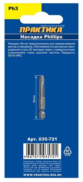 Инструментальная односторонняя насадка-бита Практика 035-721 серии «Профи» длиной 50 мм под крестовой шлиц стандарта Philips PH3 рассчитана на широкое использование с ручными и электрическими отвёртками и шуруповёртами. Оснастка сделана из высококачественной легированной хромванадиевой стали повышенной твёрдости и ударной вязкости, что обеспечивает её прочность, выносливость в самых жёстких условиях работы и продолжительный срок службы.