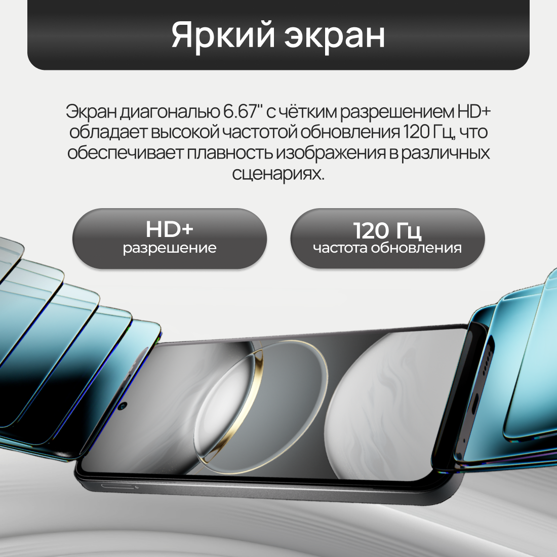 Безрамочный IPS-дисплей с диагональю 6,67 дюйма и разрешением 720x1600 пикселей предлагает яркое и чёткое изображение с реалистичной цветопередачей. Расширенный динамический диапазон HDR делает просмотр фильмов и видео более захватывающим.