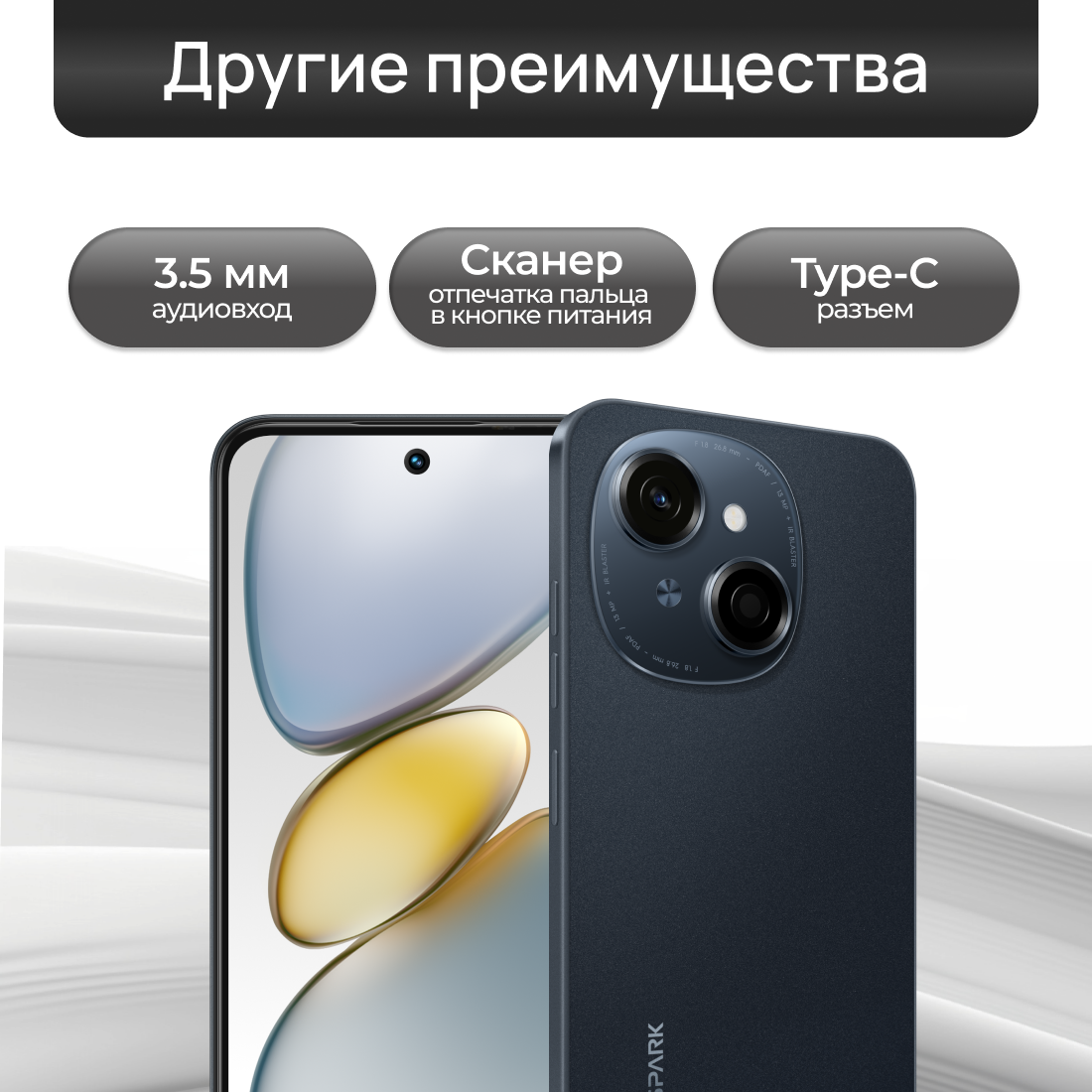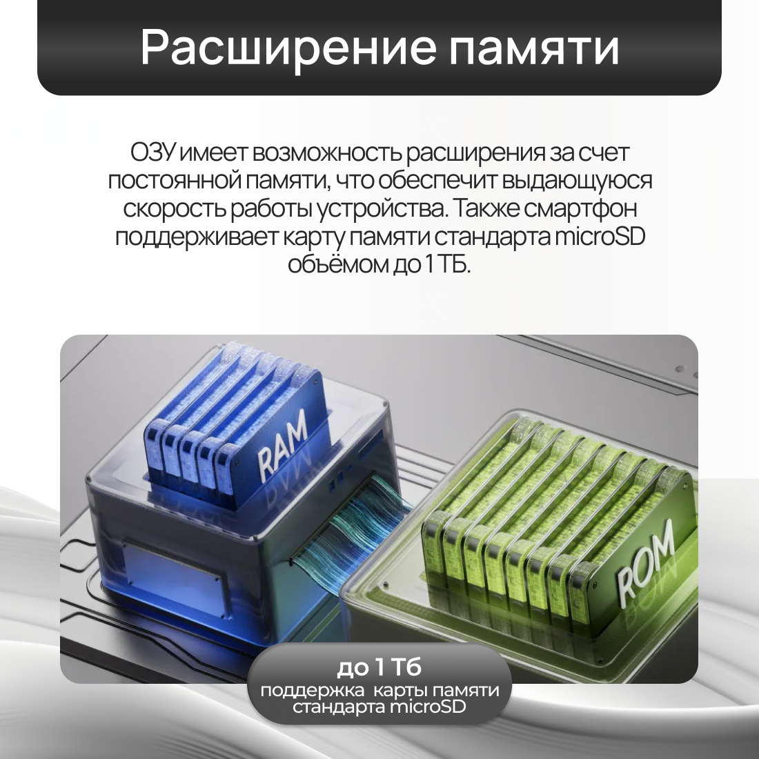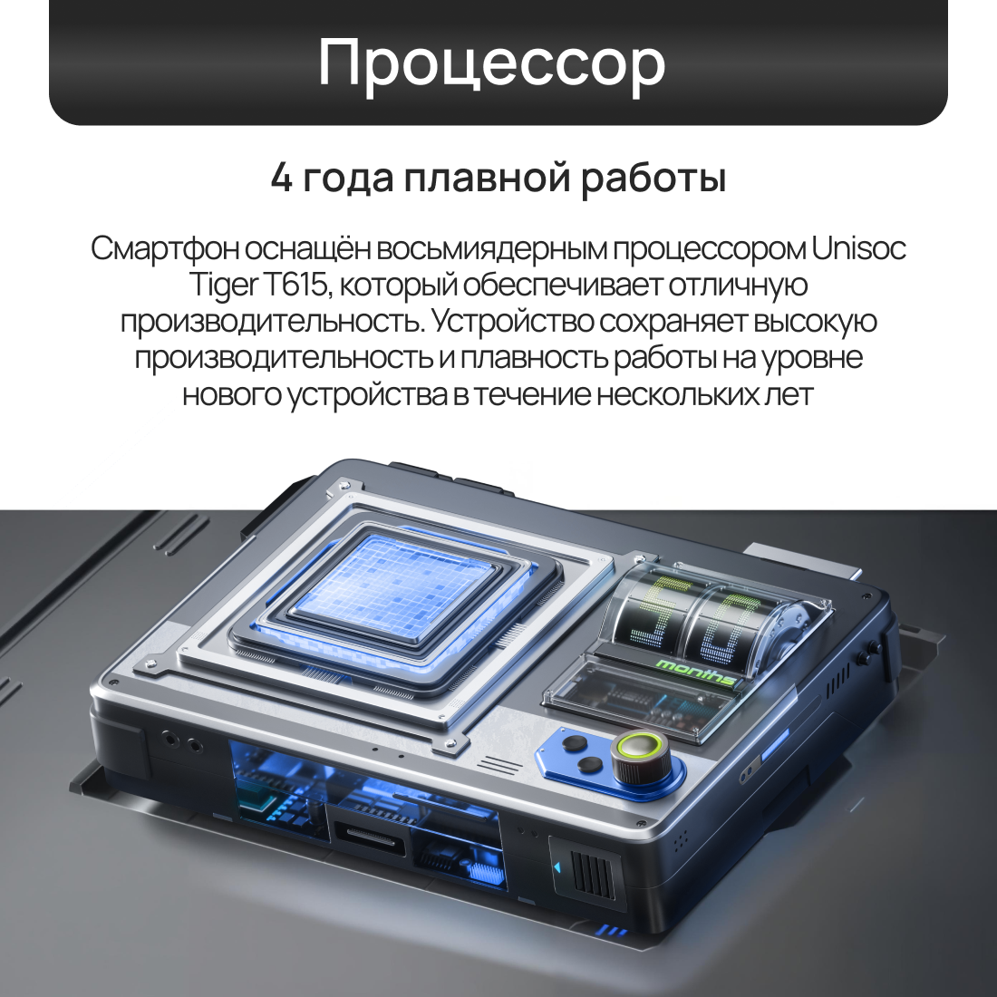 Смартфон оснащён восьмиядерным процессором Unisoc Tiger T615 с частотой 1,8 ГГц и 4 Гб оперативной памяти. Это обеспечивает быструю и плавную работу устройства. Встроенная память на 128 Гб позволяет хранить большое количество приложений, фотографий, видео и документов. Для расширения памяти можно использовать карту microSD до 1 Тб.
