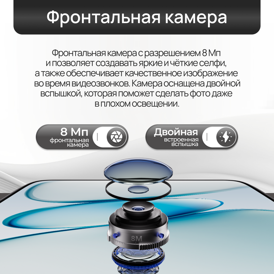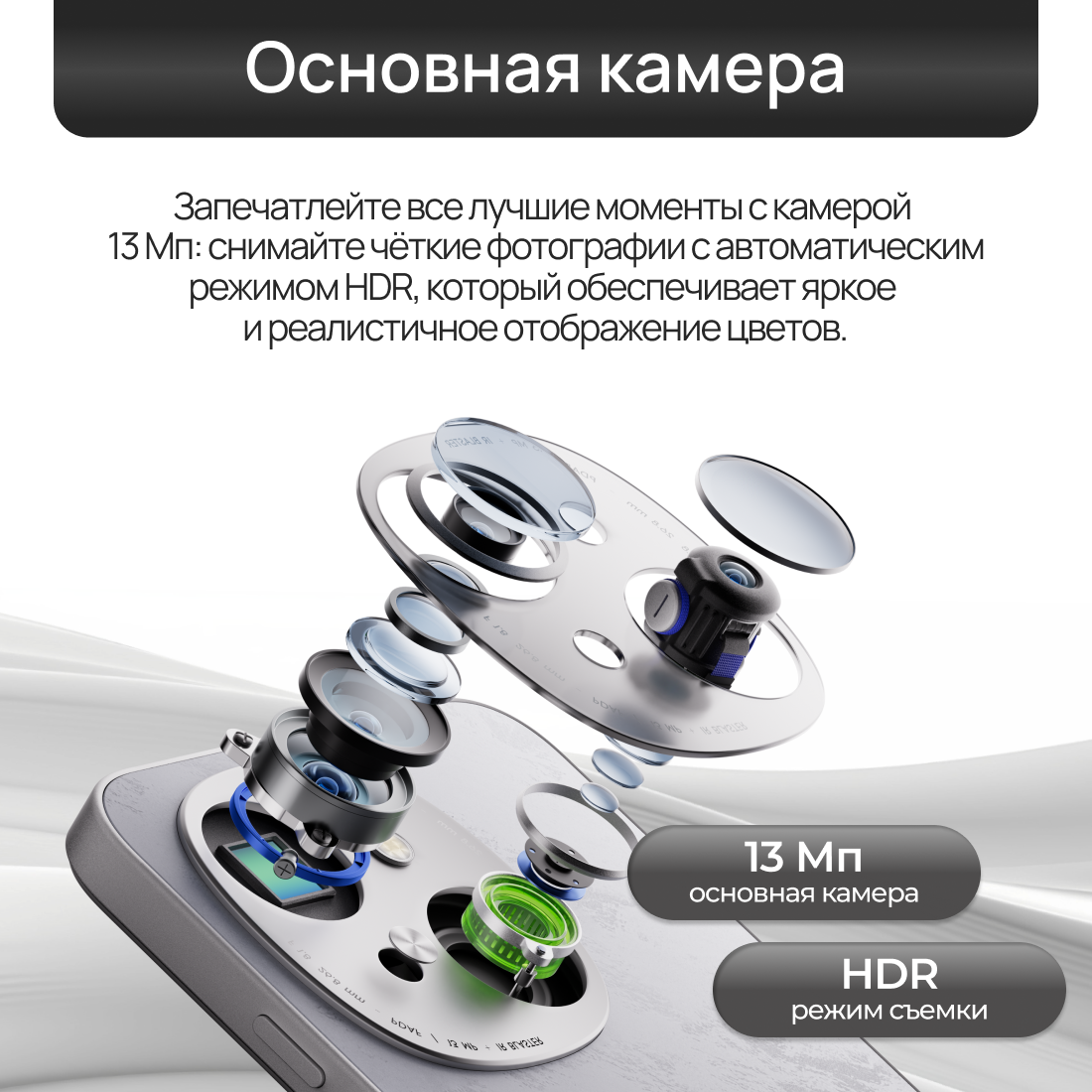 Основная камера на 13 Мп с яркой вспышкой позволяет делать чёткие снимки даже в условиях низкой освещённости. Фронтальная камера на 8 Мп также оснащена вспышкой для качественных селфи и видеозвонков.