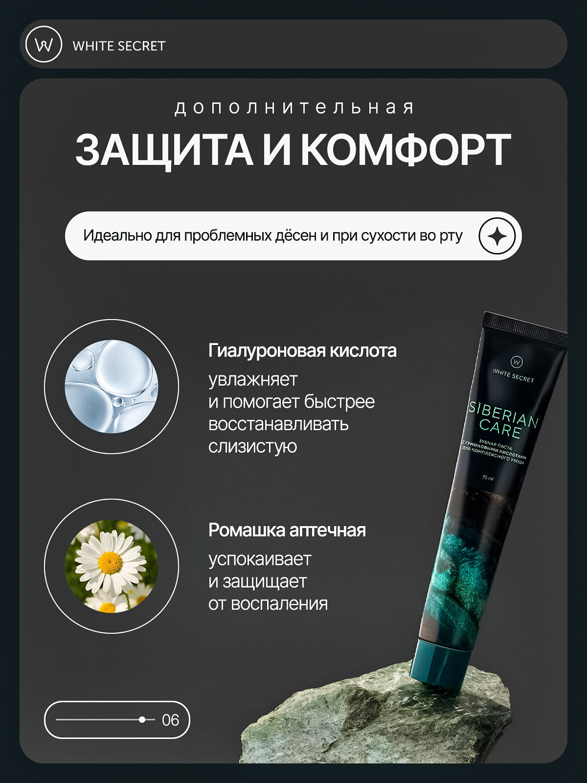 Зубная паста White Secret - единственная паста с гуминовыми кислотами в России. Разработанная в Сибири, обладает мощными регенерационными и увлажняющими свойствами. Идеально очищает, оставляя настоящее чувство свежести надолго. Благодаря ощутимому положительному влиянию на микрофлору полости рта устраняет неприятный запах. Имеет сбалансированный вкус и текстуру.