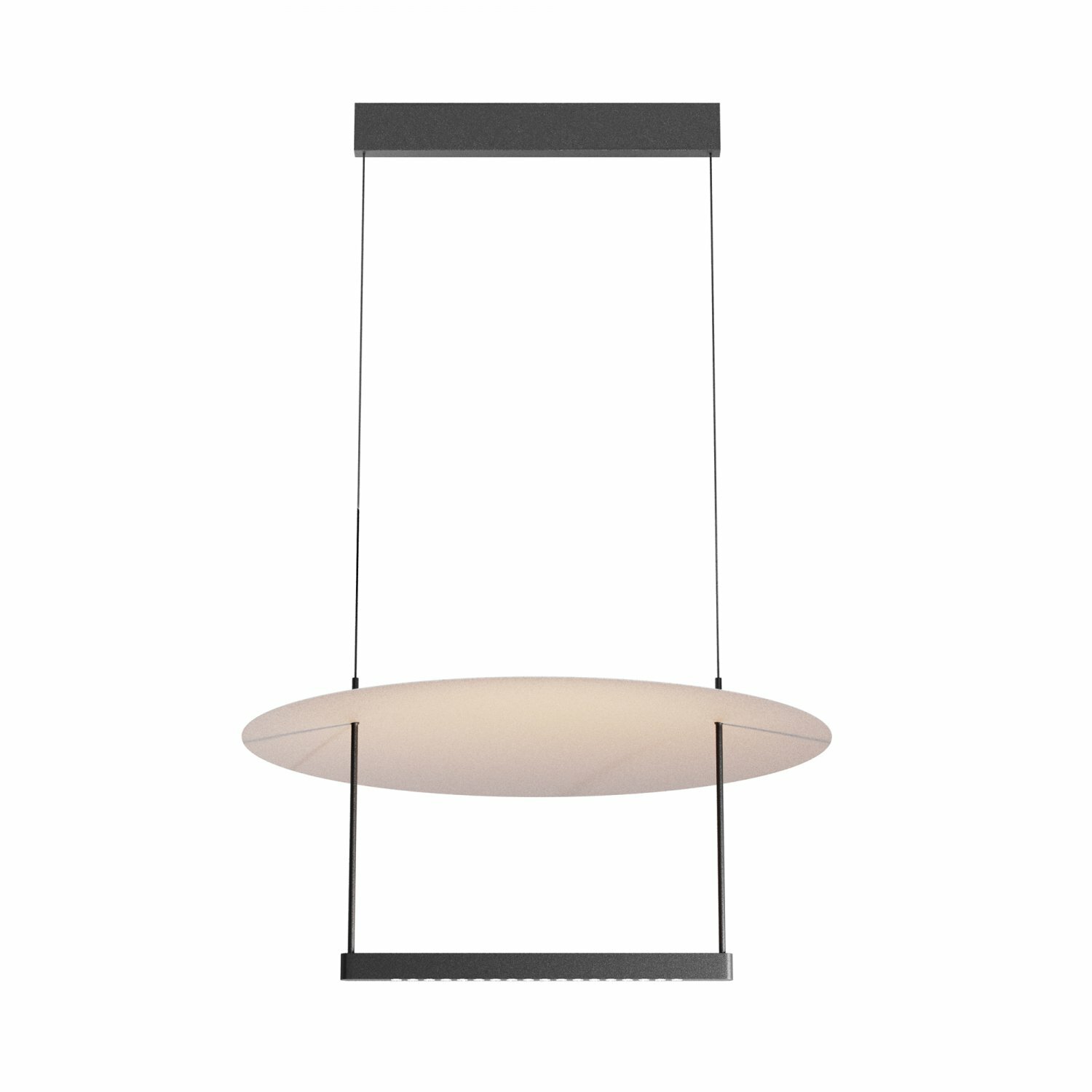 Арматура из алюминия черного цвета, контрастирует белой пластиной диаметром 420мм или 600мм. Силиконовый рассеиватель скрывает LED-источник света с температурой 3000К. В серии представлены светильники двух поколений: в первом источник светит только вверх; во втором источник светит вверх и вниз, что позволяет подсветить рабочую поверхность. Также светильники второго поколения дополнительно имеют функцию диммирования. Высота подвесных светильников регулируется, максимальная длина провода - 3 метра.