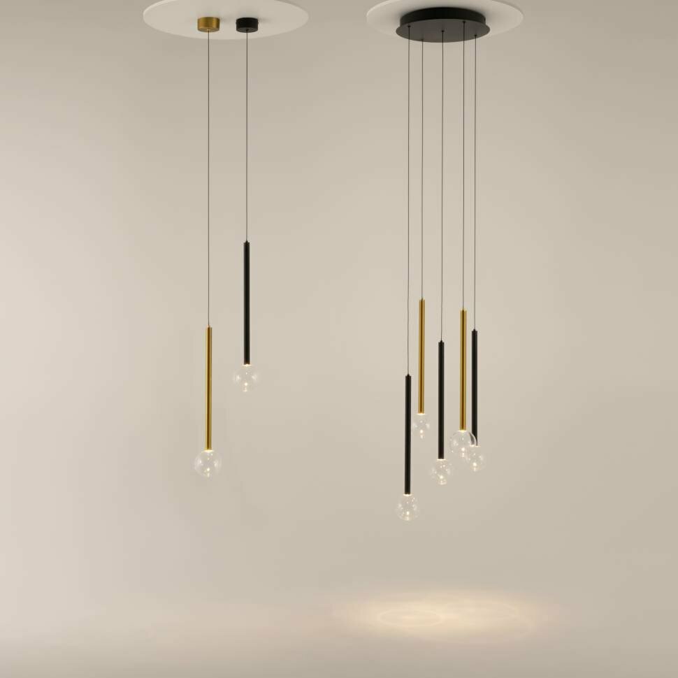Цвет арматуры — черный, латунь, комбинация черный и латунь. Материал арматуры — металл. Цветовая температура 3000К. Оригинальный «невесомый» дизайн с тонкими металлическими трубками и стеклянными шарами-плафонами. LED-источники света. Регулируемая длина провода подвесных светильников, 3 метра, подходит для помещений с высокими потолками. Каскадная композиция на 7 и 15 плафонов оснащена проводом длиной 3,5 метра для эффектных дизайнерских решений. Подходит для высоких потолков. Парящие модели для создания легкой, воздушной атмосферы в интерьере.