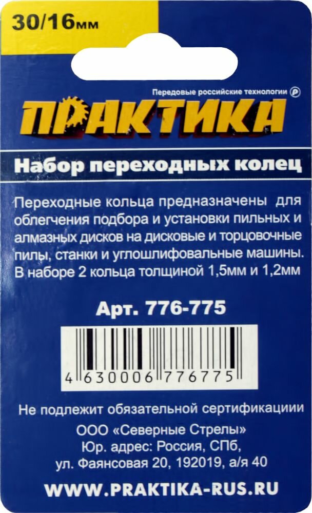 Переходное кольцо для дисков ПРАКТИКА 776-775 переходное 30/16мм