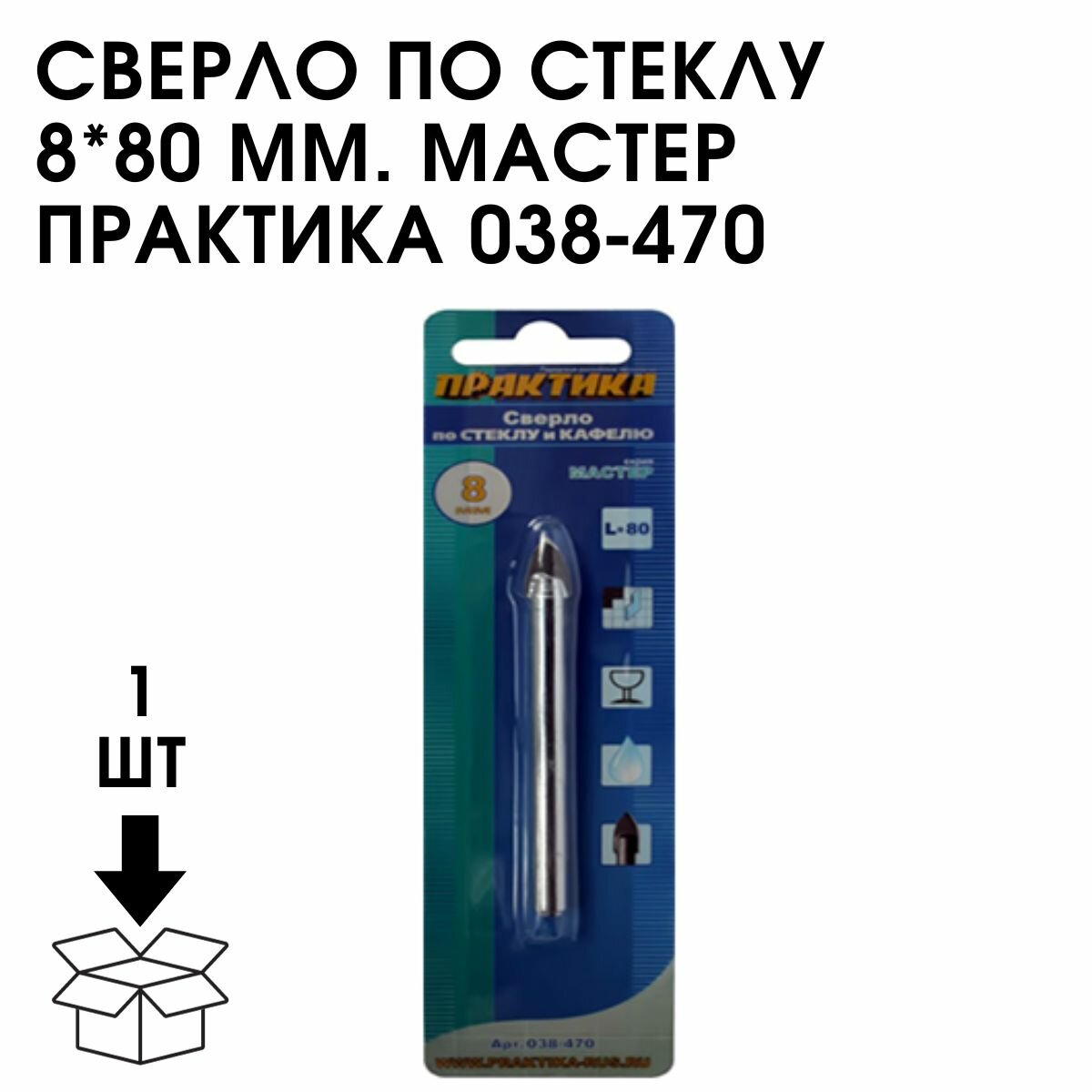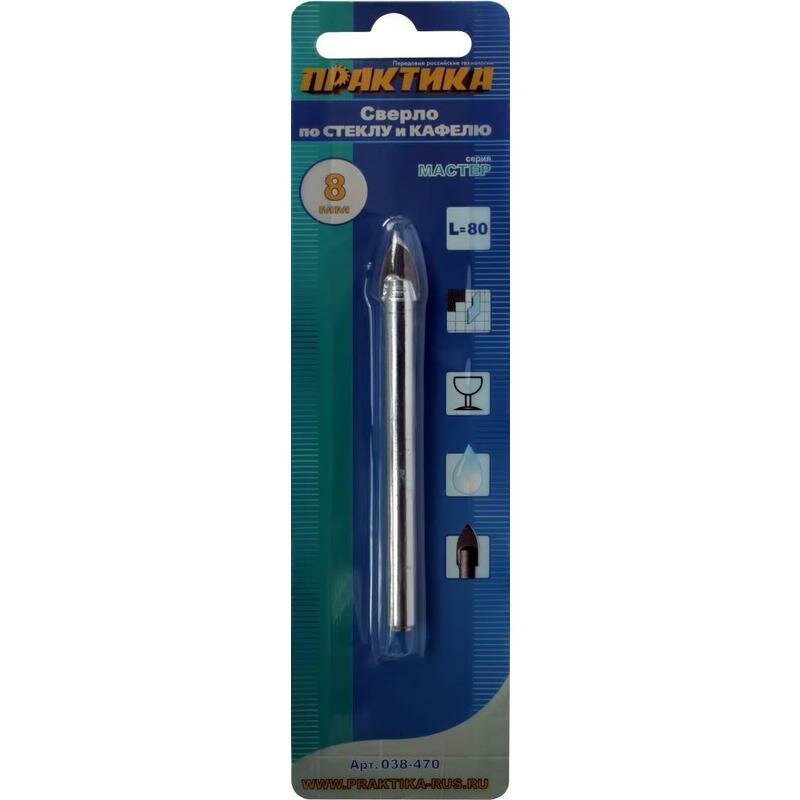 Сверло по стеклу ПРАКТИКА 038-470 8мм, по стеклу