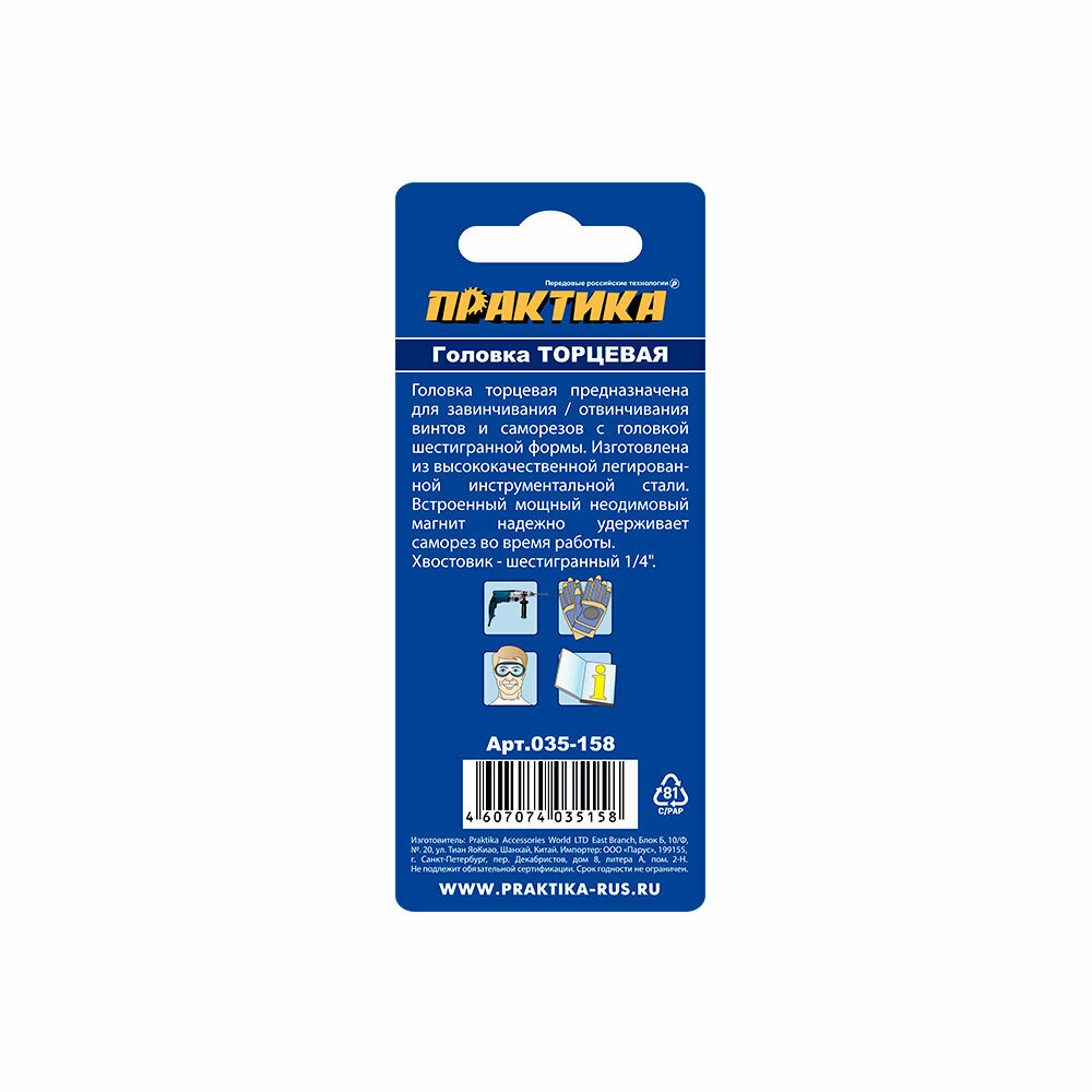 Головка магнитная "Практика" предназначена для завинчивания и отвинчивания винтов и саморезов с головкой шестигранной формы. Подходят для работы с наиболее популярными винтами с метрической резьбой и наружной шестигранной головкой, а также длинными шурупами и кровельными саморезами. Изготовлены из легированной инструментальной стали. Встроенный неодимовый магнит удерживает саморез во время работы. Хвостовик - шестигранный 1/4’’.