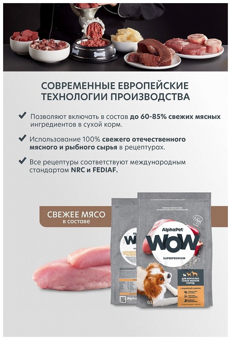 • 74% мясного белка • Свежее мясо в составе •Особая форма и небольшой размер гранул специально подобраны для собак маленьких и карликовых пород •Уникальный комплекс натуральных добавок AlphaPetBIO® •Натуральные ингредиенты •Не содержит ГМО, искусственных красителей и ароматизаторов •Ингредиенты, пригодные в пищу человеку, уровня Human Grade •Бережная технология, сохраняющая вкусовые и питательные свойства свежего мяса