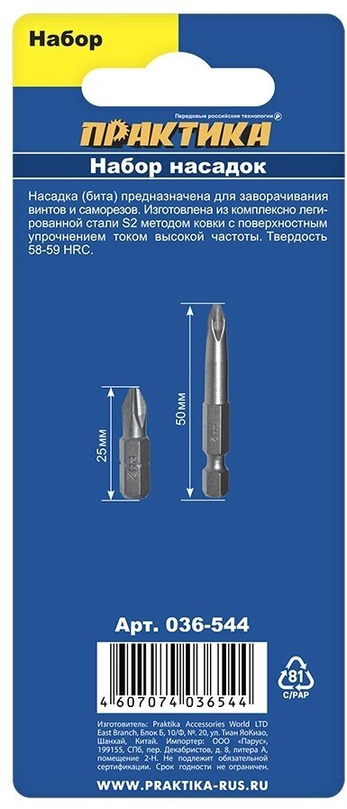 | Комплект поставки | 2 биты длиной 25 мм (PH2, PZ2), 2 биты длиной 50 мм (PH2, PZ2) |