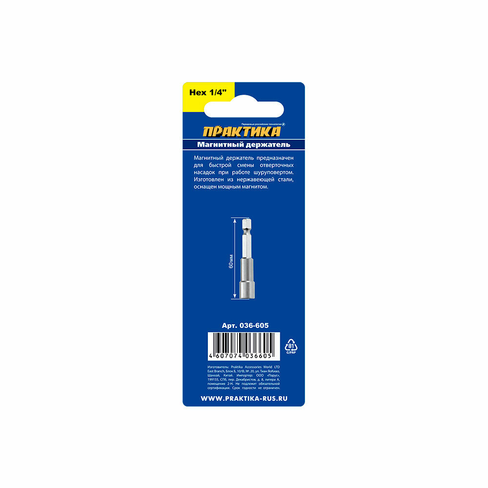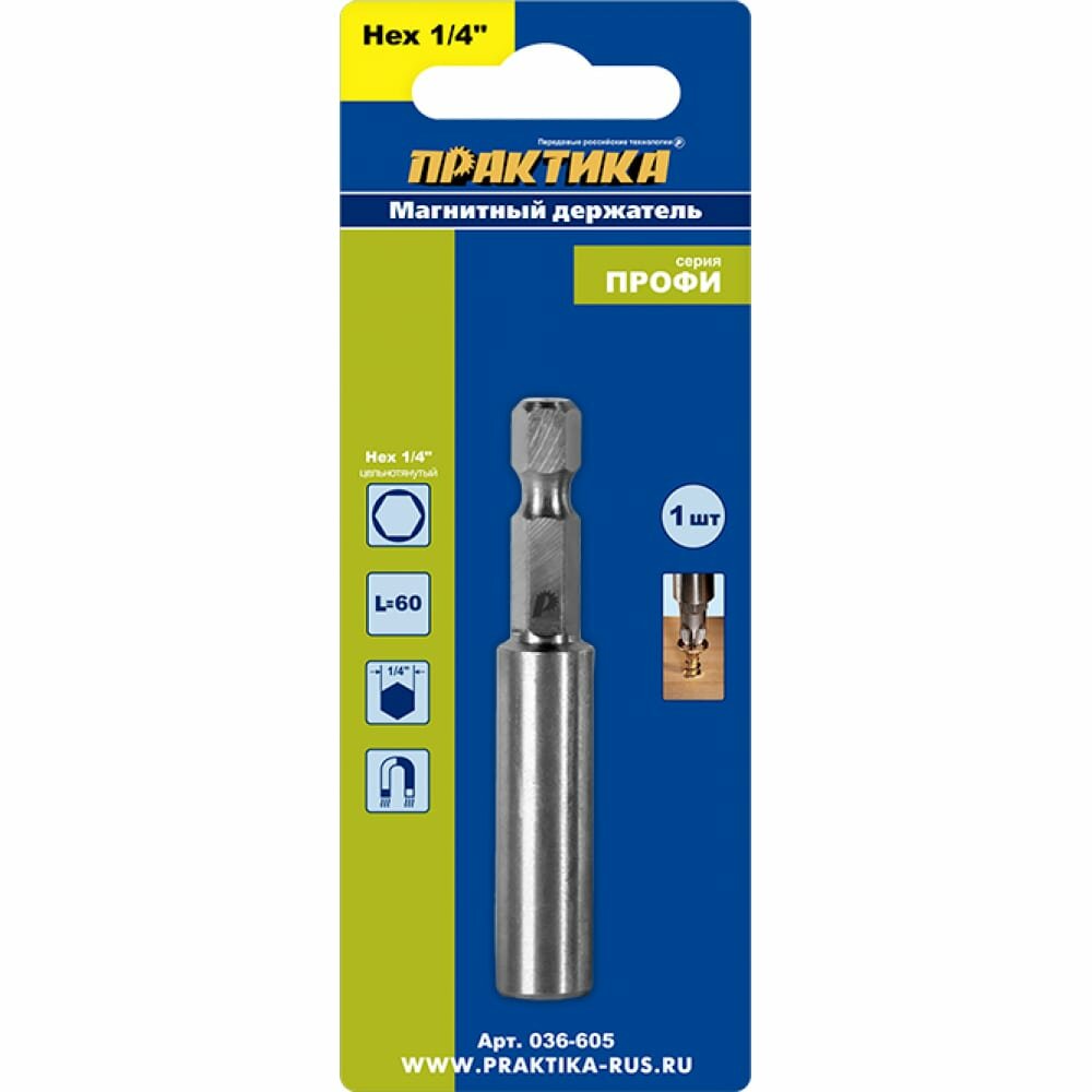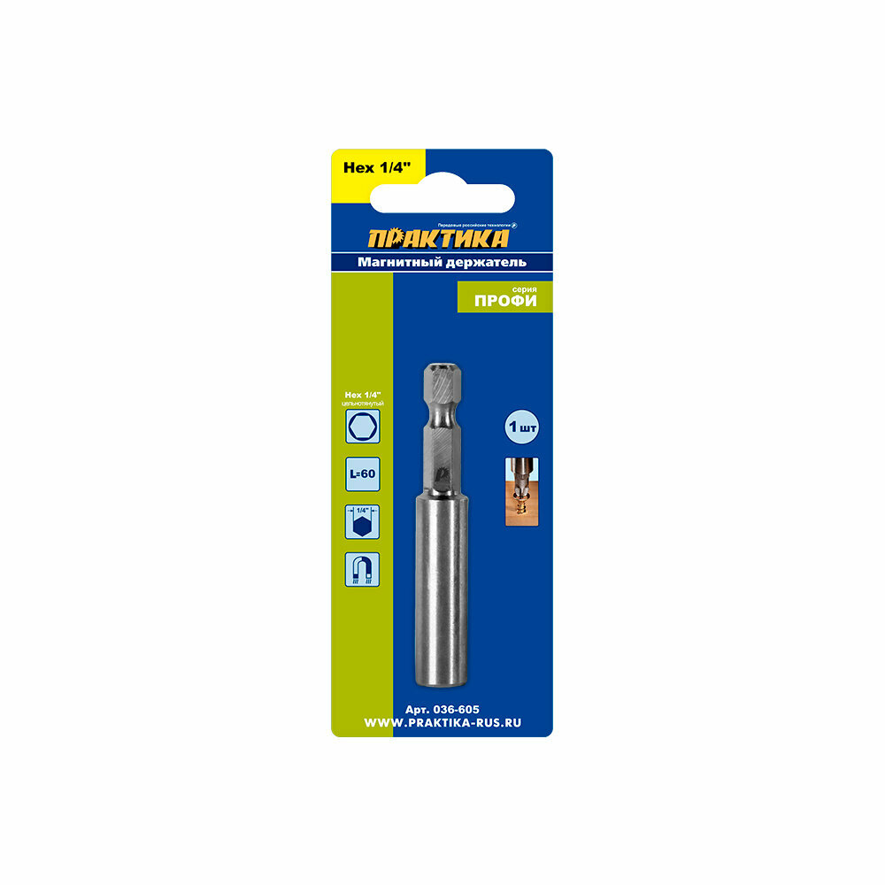 Цельнотянутый держатель ПРАКТИКА 036-605 для бит, цельнолитой 60мм, 1шт.
