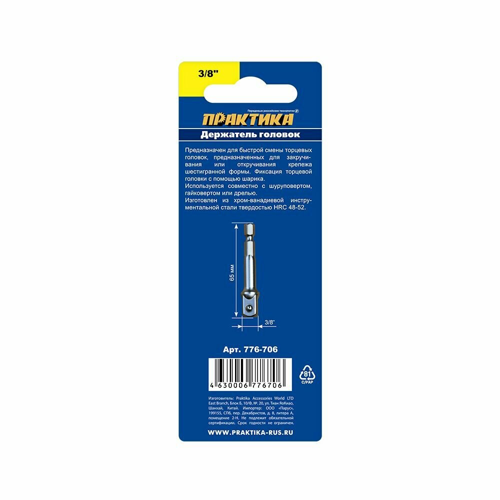 Адаптер для головок ПРАКТИКА 776-706 для головок hex 1/4'' - квадрат 3/8'', 65мм