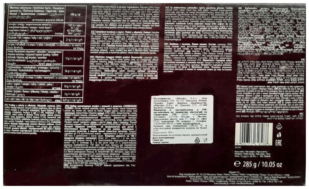 | Состав | Шоколад (50%) [сахар, мякоть какао, жиры растительные (пальмовое, ши), какао-жир, волокна, которые: лецитин (из сои) и Е 476; ароматизатор], сахар, вишня в спирте (13%) (вишня, спирт этиловый, вода), глюкозный сироп, этиловый спирт (1,1%), концентрат вишневого сока (0,56%), стабилизатор: инвертаза, загуститель |