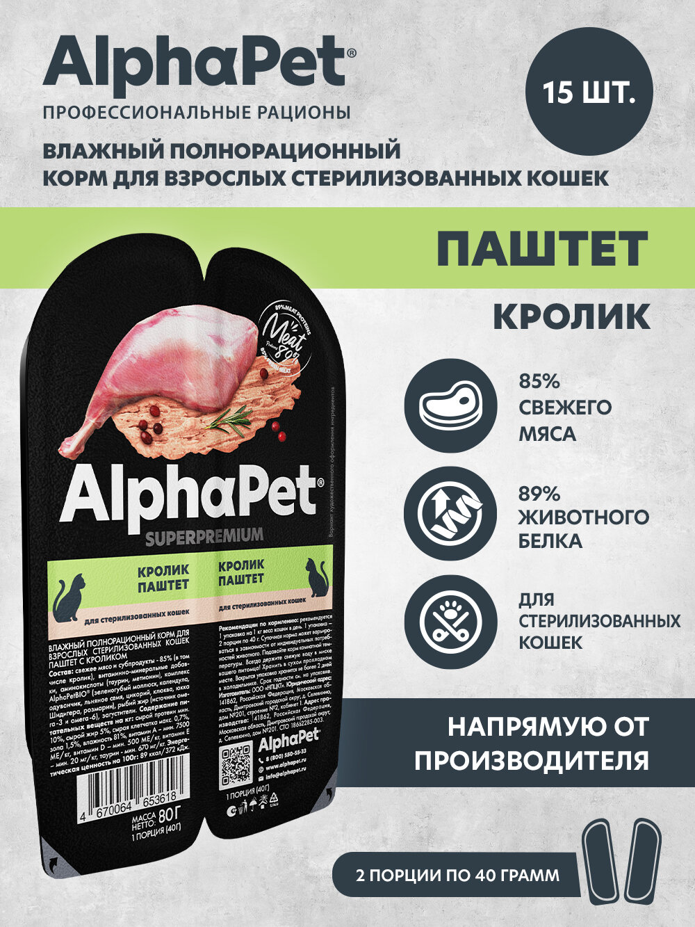Здоровый и активный питомец – главная задача каждого хозяина. Команда AlphaPet создает и производит полезные корма высшей категории качества Holistiс, давая возможность каждому владельцу быть уверенным в правильном выборе кормления для своего животного. AlphaPet SUPERPREMIUM - супер-премиальное питание на основе натуральных ингредиентов. Линейка питания для животных, владельцы которых хотят быть уверены в лучшем выборе корма для своего питомца. Максимально открытый и понятный состав продукта, приготовленного по инновационной технологии из свежего мяса и с содержанием большого количества мясного белка!Пашеты AlphaPet:Из свежего мяса;Беззерновая рецептура;Ингредиенты качества human grade;Уникальный комплекс AlphaPetBio;Вкусовая привлекательность и поедаемость проверены в собственно центре AlphaPet.*Не содержит ГМО искусственных красителей, ароматизаторов, консервантов, кукурузу, пшеницу и добавленный глютен.
