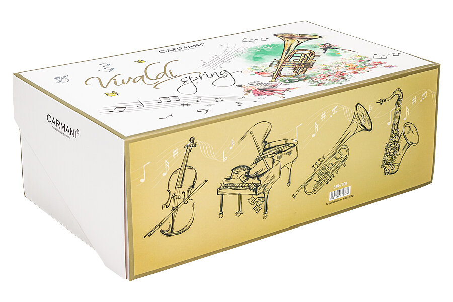 "Музыкальная" коллекция из костяного фарфора A. Vivaldi от Carmani привлекает внимание декором по мотивам цикла концертов для скрипки с оркестром "Времена Года".Каждый из четырёх декоров посвящён определенному времени года, ему соответствует музыкальный инструмент, характерные цвета и детали сезона, а также партитура концерта.Форма кружек и чашек V-образная, цвет блюдца в чайной паре передает палитру времени года. Ноты красиво обрамляют верх изделия и произвольно "разбросаны" по блюдцу.Особое внимание заслуживает подарочная упаковка, где вложена часть партитуры на красивом художественном листе.Отличный подарок для меломанов и не только.