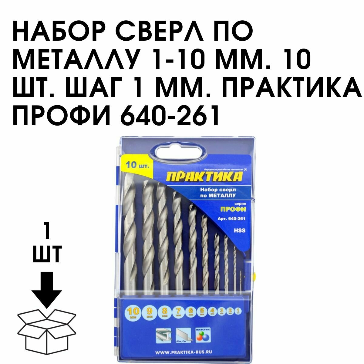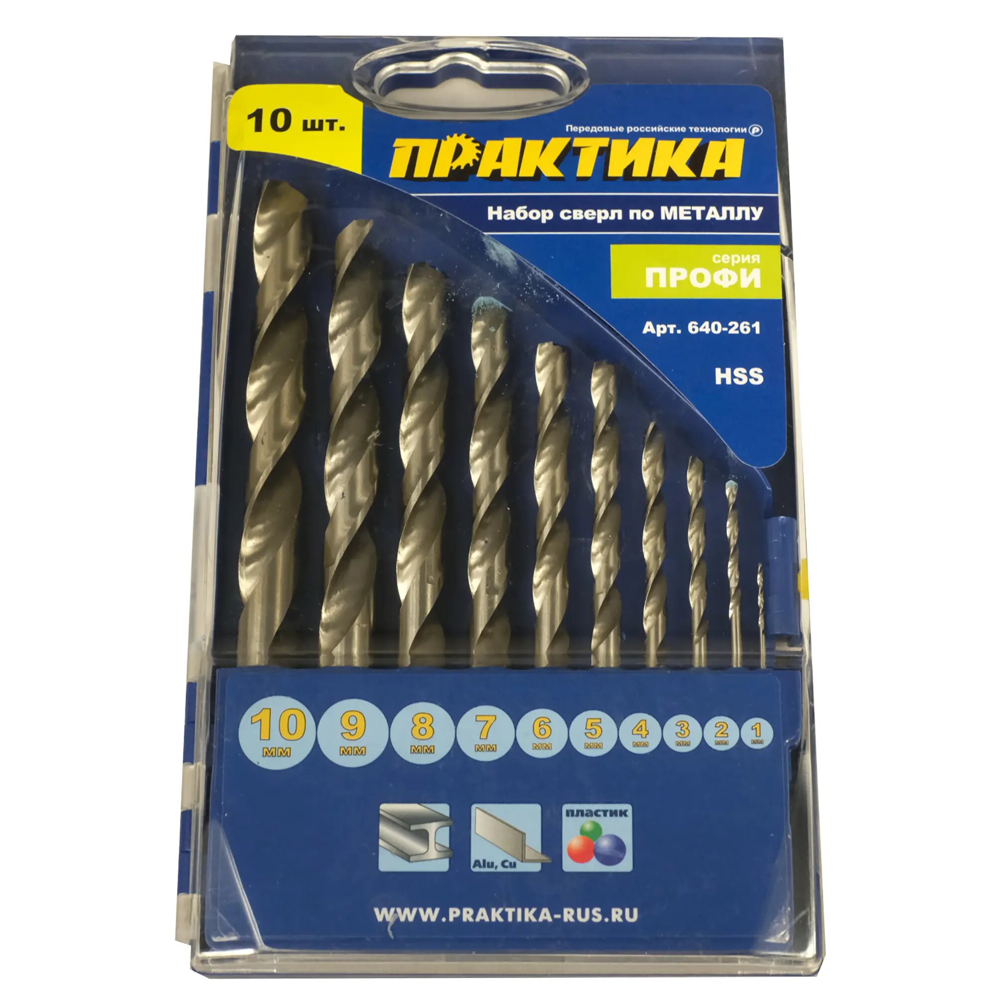 | Прочие особенности и свойства | Опытному мастеру не стоит переживать по поводу качества проводимых работы, если выбор пал на набор сверл ПРАКТИКА "Профи" 640-261. В этот комплект включены 10 высококачественных сверл, которые покажут достойные результаты при применении вместе с хорошей дрелью либо шуруповертом.,Сверла ПРАКТИКА "Профи" 640-261 предназначены для работы с деталями из металла, заготовками и поверхностями из различных металлов. Производитель позаботился о том, чтобы каждый из инструментов гарантировал точность и высокую скорость выполнения работ. Поэтому для изготовления сверл использована высококачественная быстрорежущая сталь.,Особенность комплекта в том, что он предоставляет возможность расширить спектр работ за счет разнообразия диаметров. Сверла имеют диаметр от 1 и до 10 мм, причем градация составляет 1 мм |