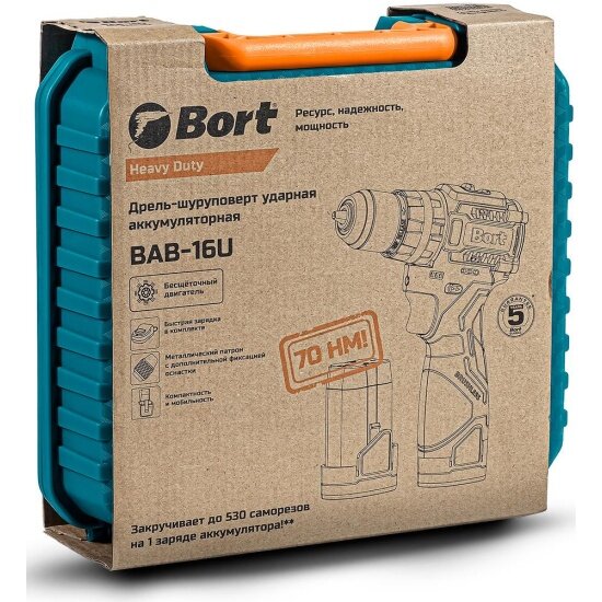 Дрель-шуруповерт аккумуляторная Bort BAB-16U - это компактный универсальный инструмент, который подойдёт как для профессионального использования, так и для бытовых нужд.Шуруповёрт оснащён мощным бесщеточным двигателем, который обеспечивает высокую скорость вращения до 1700 оборотов в минуту, высокий крутящий момент до 70 Нм.В комплекте идут два аккумулятора ёмкостью 2 А/ч, что обеспечивает длительную работу без подзарядки.Преимущества Регулировка скорости. С помощью кнопки пуска можно регулировать скорость вращения шпинделя в зависимости от задачи. Это даёт возможность точно настроить инструмент под конкретные условия работы. Шуруповерт имеет 2 скорости редуктора от 0 до 420 и 1700 оборотов в минуту Реверс. Функция реверса позволяет не только закручивать, но и выкручивать крепёжные элементы Подсветка рабочей зоны. Светодиодная подсветка рабочей зоны обеспечивает хорошую видимость даже при недостаточном освещении. Это особенно полезно при работе в труднодоступных местах или при недостаточной освещённости Эргономичный дизайн. Анатомическая рукоятка, малые габариты и небольшой вес инструмента обеспечивают комфорт при работе. Это снижает утомляемость и повышает производительность труда
