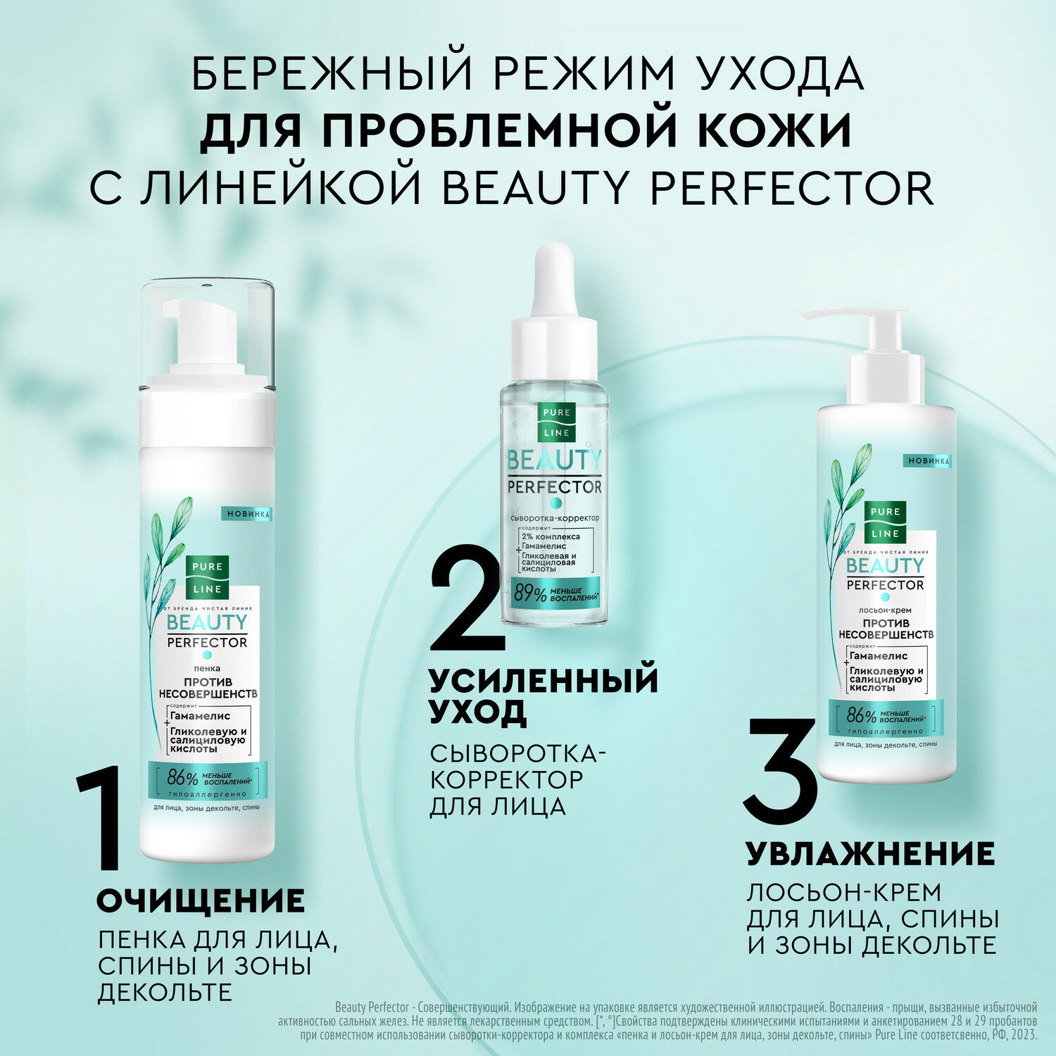 Гипоаллергенно. Подходит для всех типов кожи, включая чувствительную, с 14 лет. Клинически доказано: 86% меньше воспалений. Для наилучшего результата воспользуйтесь всеми продуктами программы ухода Beauty Perfector. Очистите кожу пенкой, для лица и тела используйте лосьон-крем, для лица сыворотку-корректор. Продукты серии усиливают действие друг друга. Кожа успокаивается, улучшается ее микрорельеф, нормализуется выработка кожного сала.