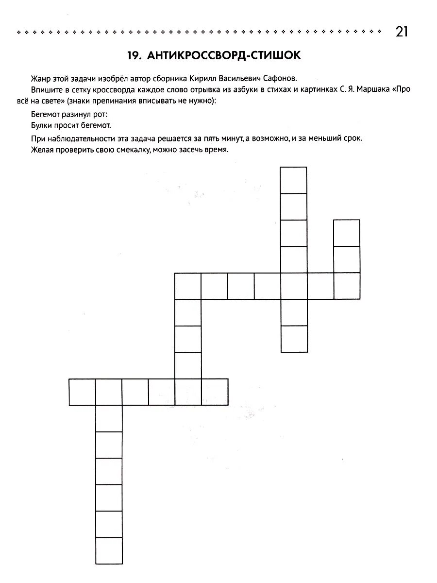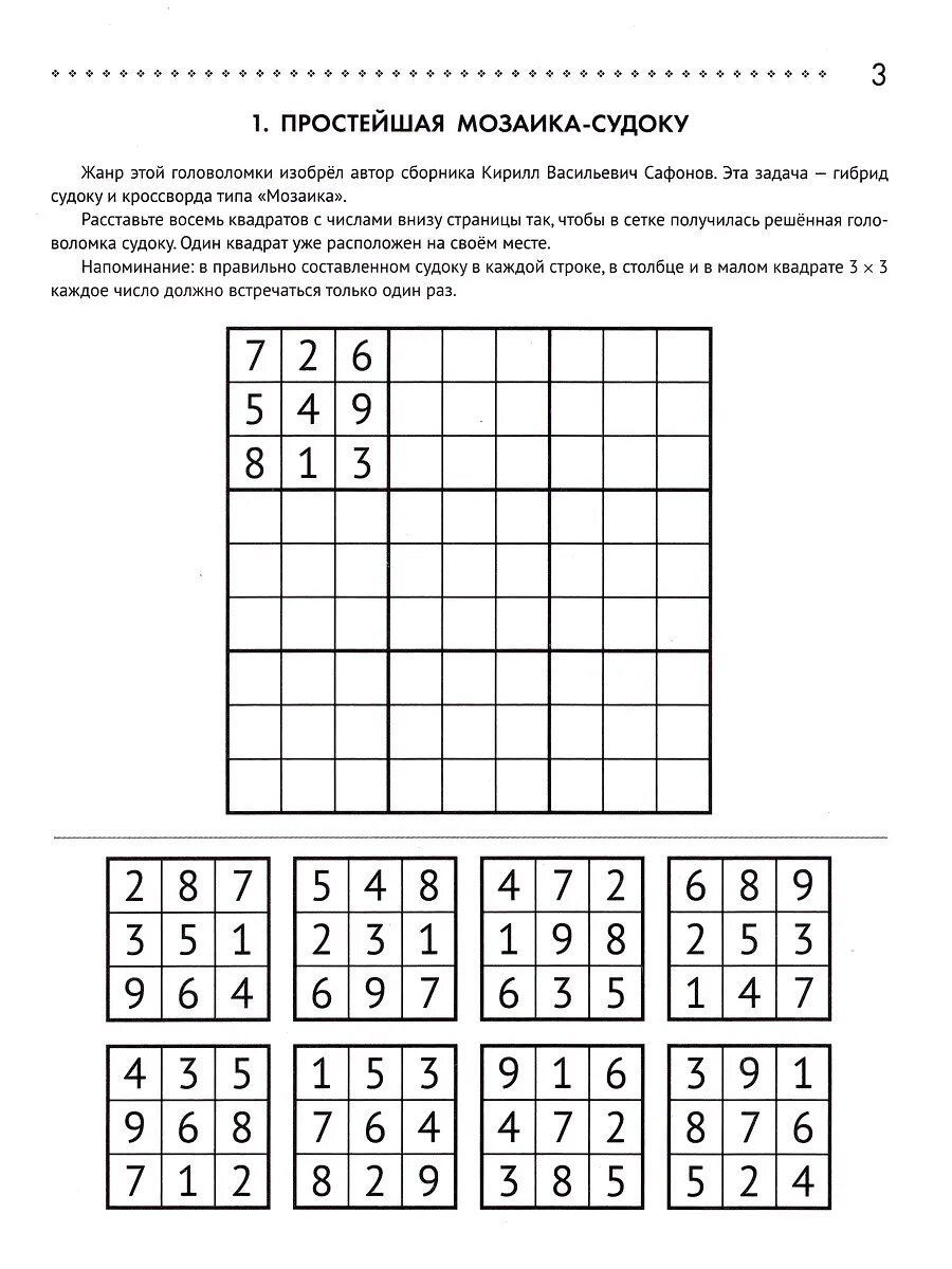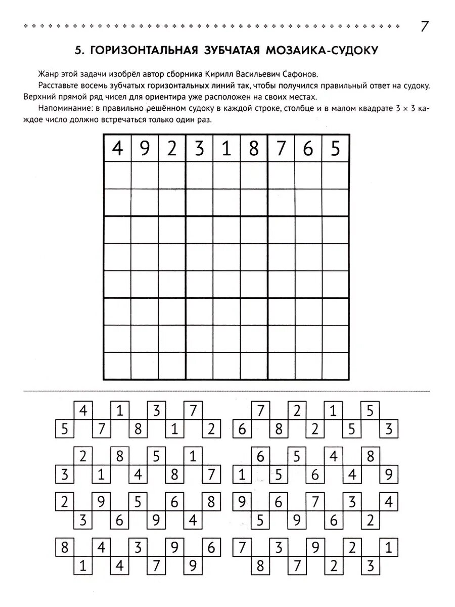 В этой книге для вас напечатаны кроссворды, числовые головоломки и другие знакомые вам задачи. Но не они составляют основу данного сборника. Жанры большинства заданий, которые представлены здесь, редко встречаются в российской периодике. 51 вид головоломок изобрёл автор сборника Кирилл Васильевич Сафонов. 22 придуманных им жанра задач публикуются в этой книге впервые. Всего же Кирилл Васильевич изобрёл и спроектировал около 170 жанров словесных, числовых и фигурных головоломок.