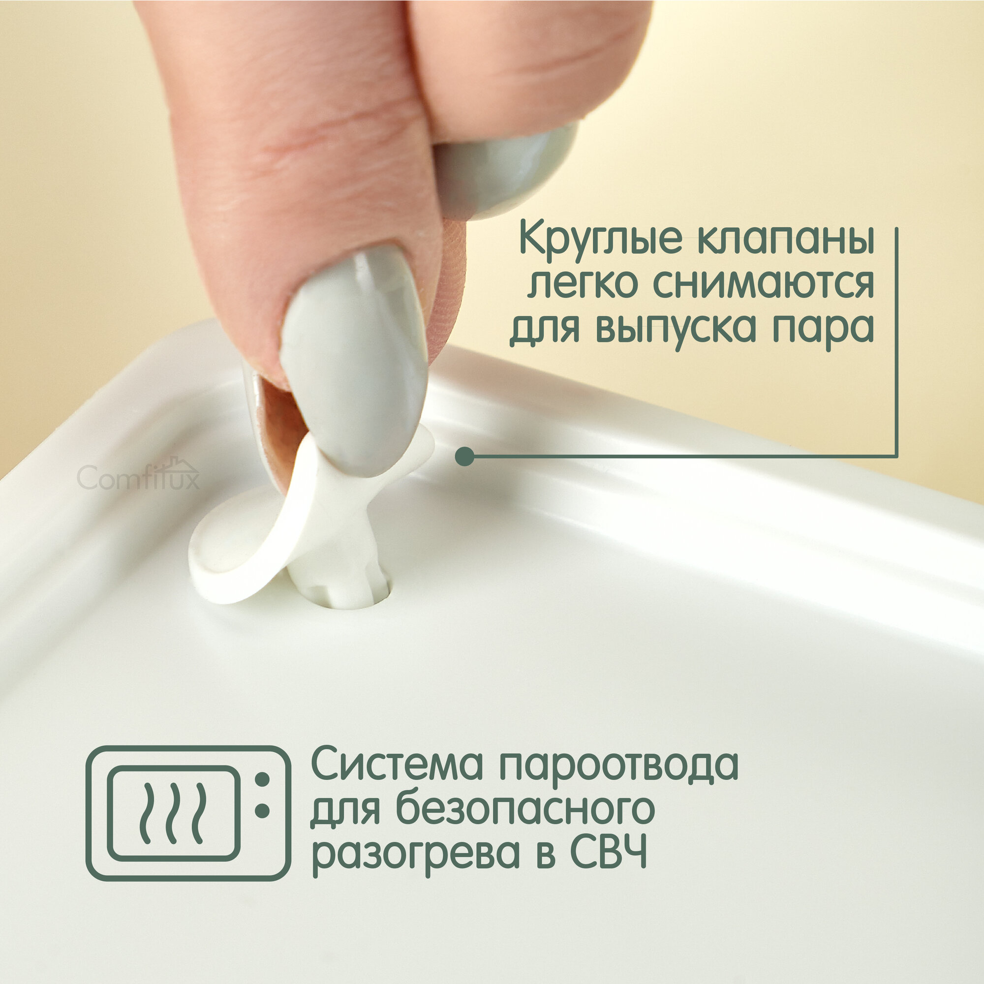 | Особенности | Ланч-бокс выдерживает температуры от -20 до +120 °C. Съёмные круглые клапаны для выпуска пара обеспечивают безопасность при разогреве пищи в микроволновой печи. |