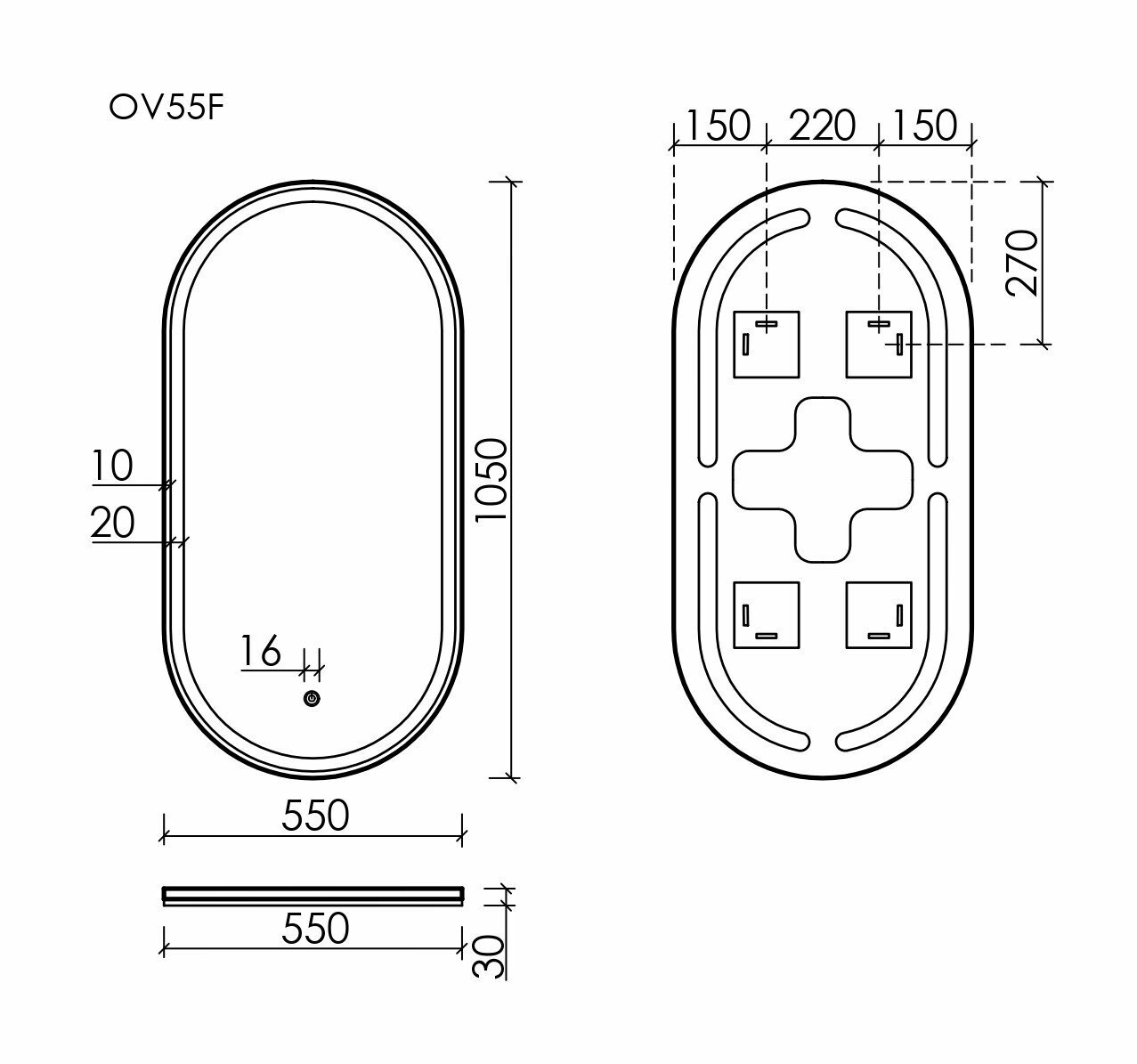 Зеркало овальное с фронтальной подсветкой. Настенный монтаж . Размер 550 x1050 мм.Температура света 6000 K. Управление прикосновением. Диммируемый сенсор регулировки подсветки.