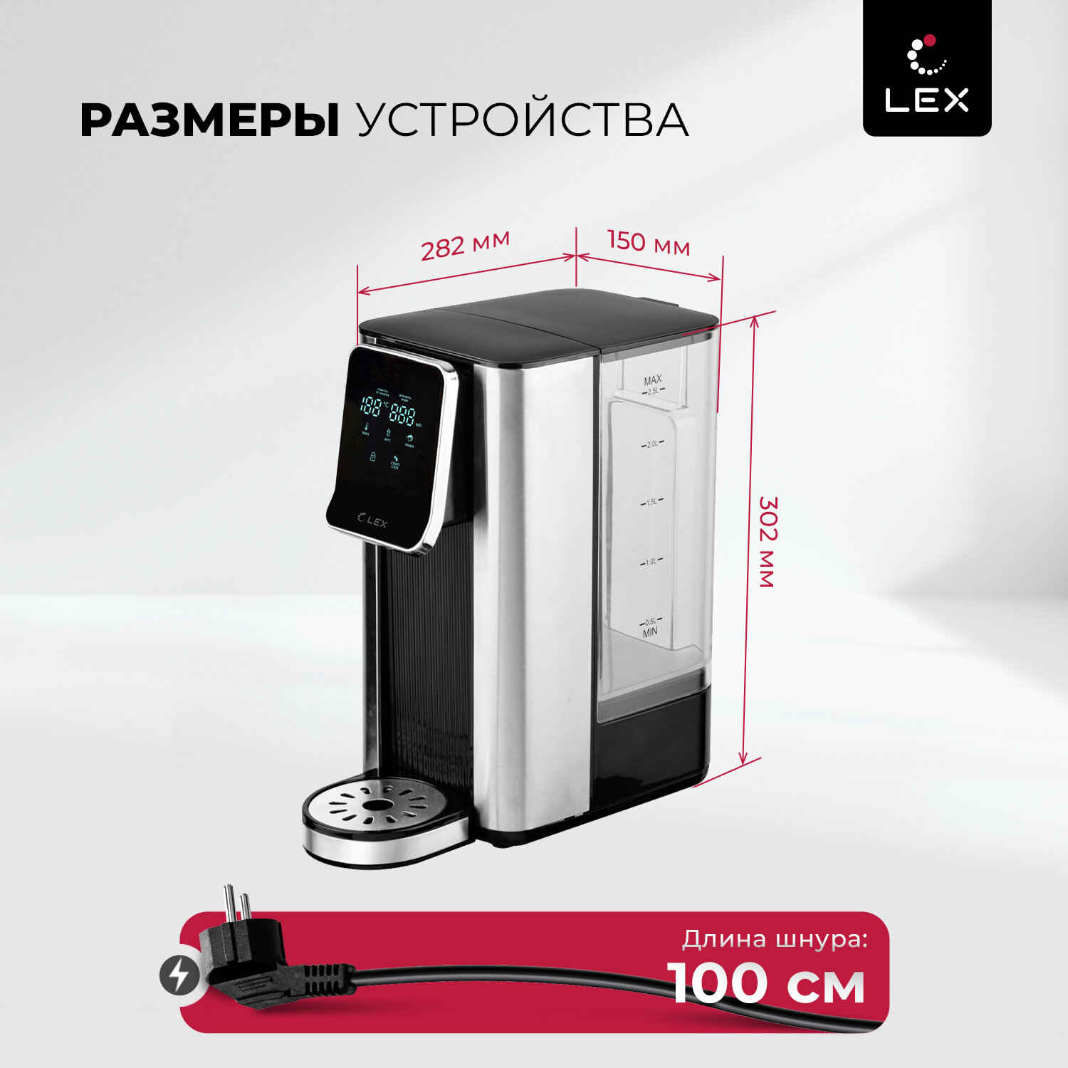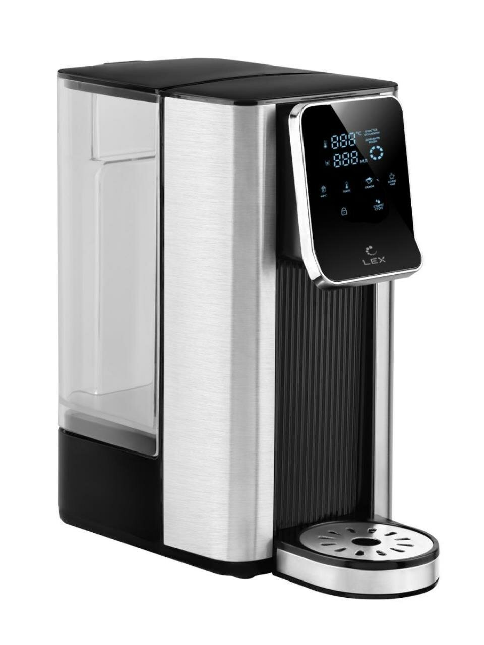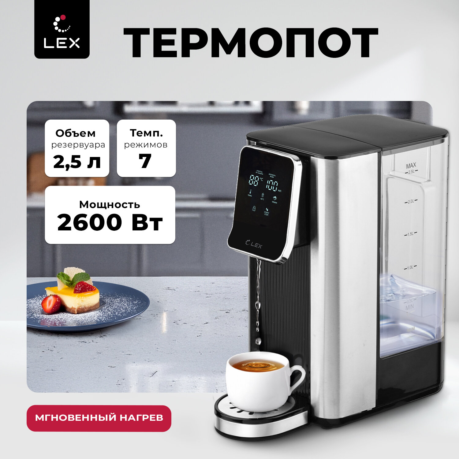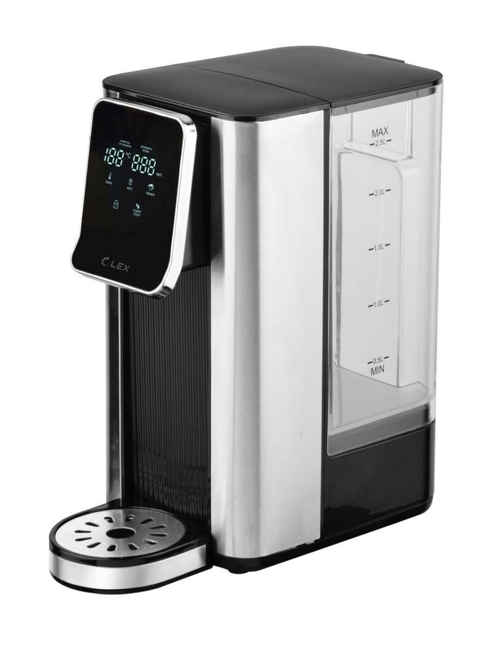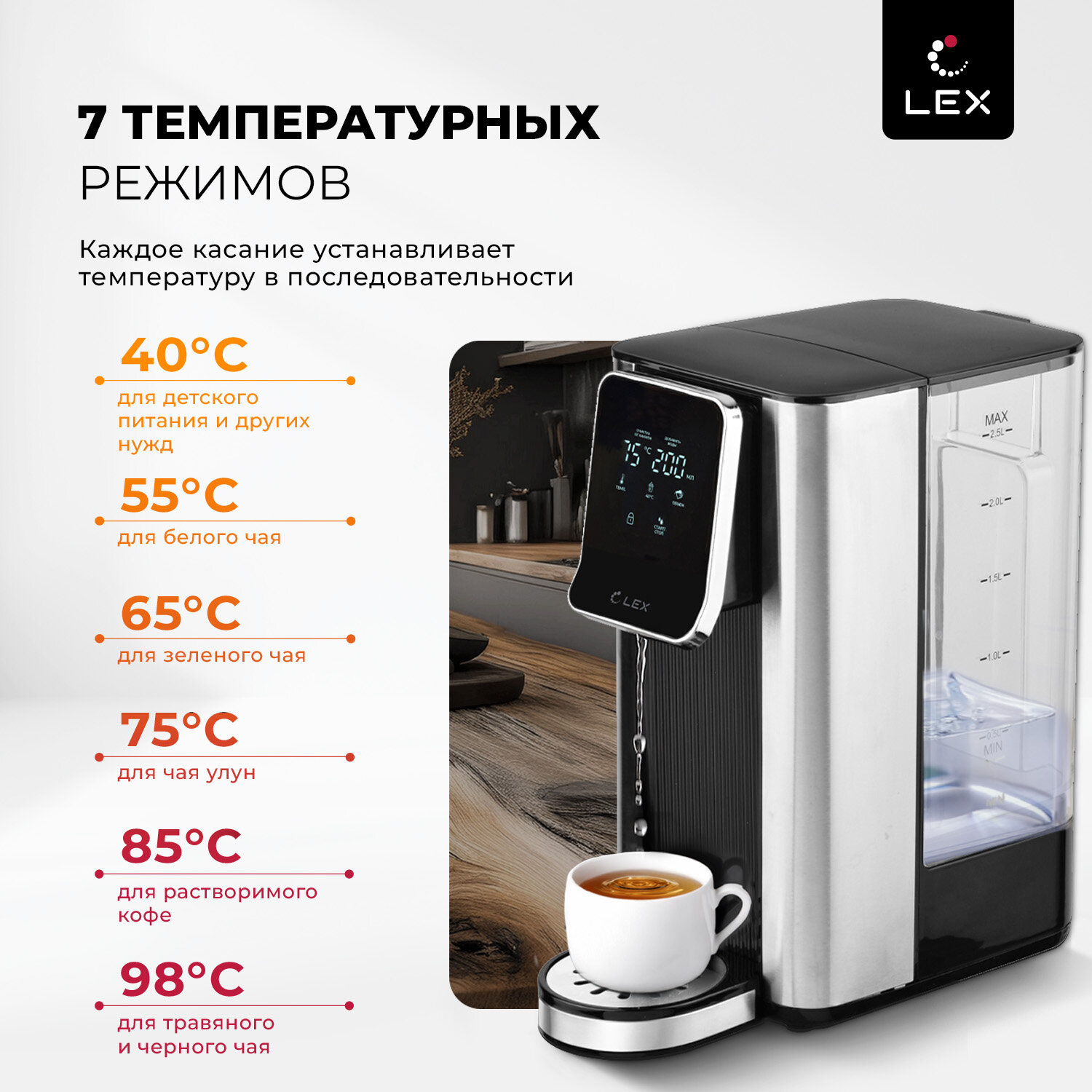 Термопот электрический LEX совместил в себе функции чайника и термоса. Колба емкостью 2,5 литров с режимом постоянного поддержания выбранного уровня подогрева воды (45°, 55°, 65°, 85°, 95°, 100 °С) обеспечивает достаточный объем для чаепития в зависимости от вида заваривания разных сортов чая или приготовления детских смесей. Сенсорное управление в сочетании с информативным цифровым дисплеем делает термопот удобным и простым в использовании.