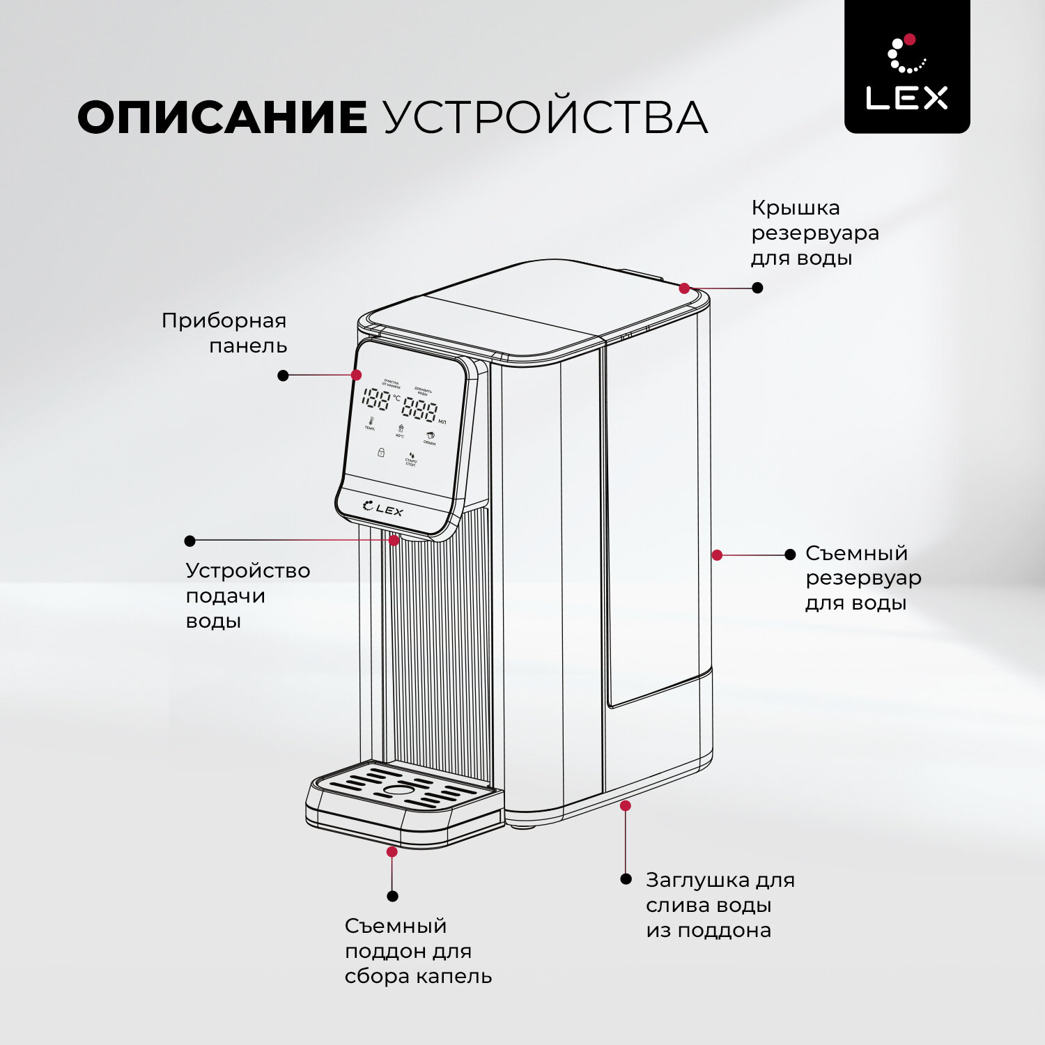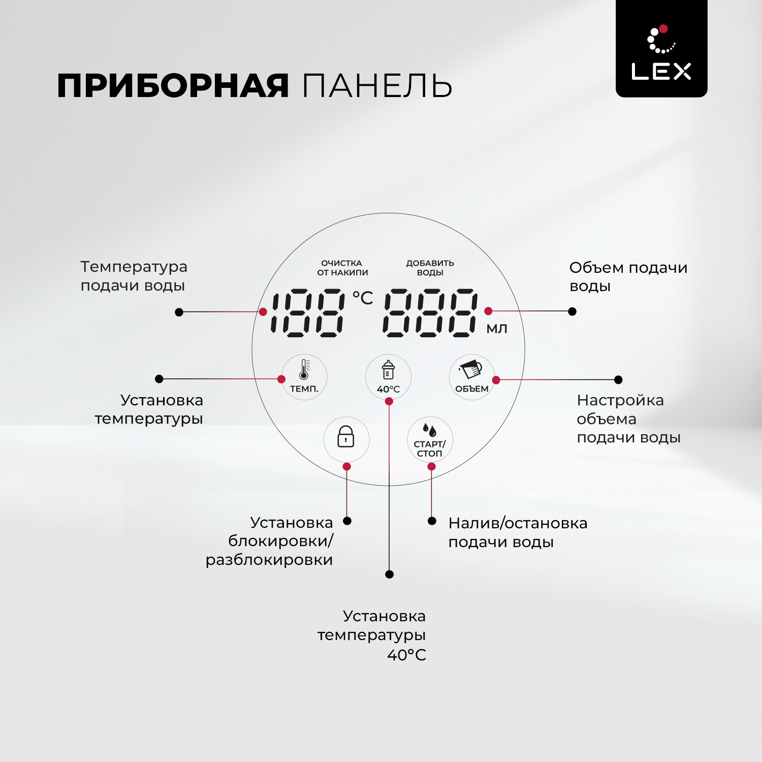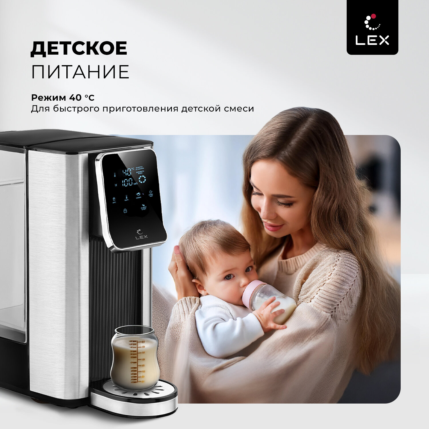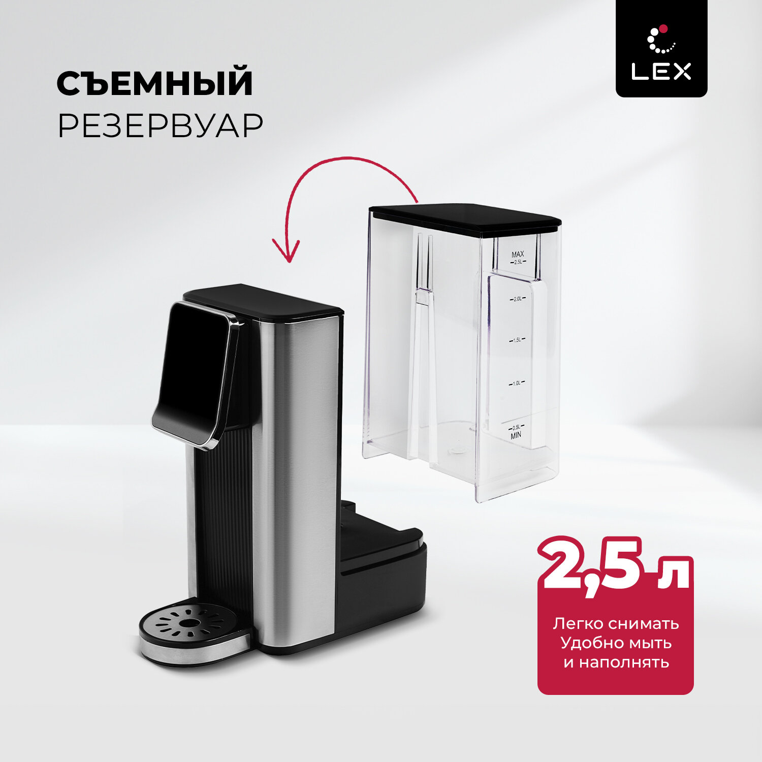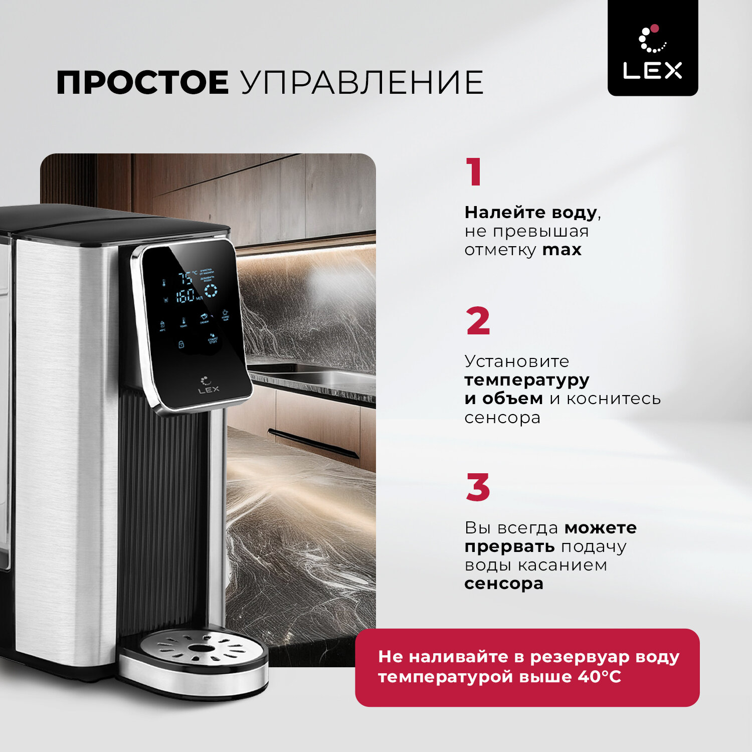 Термопот электрический LEX совместил в себе функции чайника и термоса. Колба емкостью 2,5 литров с режимом постоянного поддержания выбранного уровня подогрева воды (45°, 55°, 65°, 85°, 95°, 100 °С) обеспечивает достаточный объем для чаепития в зависимости от вида заваривания разных сортов чая или приготовления детских смесей. Сенсорное управление в сочетании с информативным цифровым дисплеем делает термопот удобным и простым в использовании.