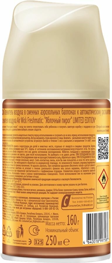 Наполните дом теплым ароматом яблочного пирога с Air Wick Яблочный пирог. Вставьте сменный баллон в элегантное устройство, выберите интенсивность распыления, и Air Wick Freshmatic будет наполнять длительным ароматом дом автоматически день за днем. Продукт предназначен для использования в автоматических освежителях воздуха.