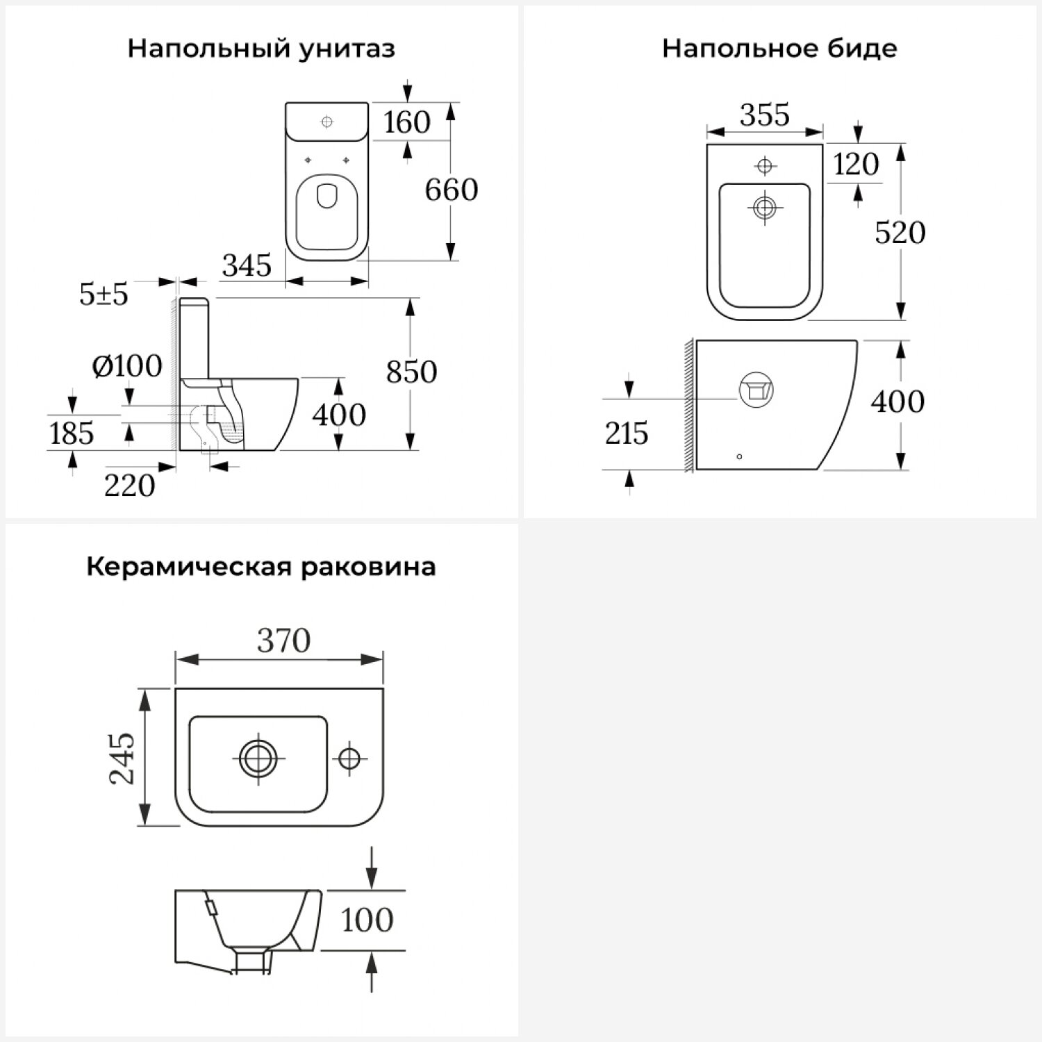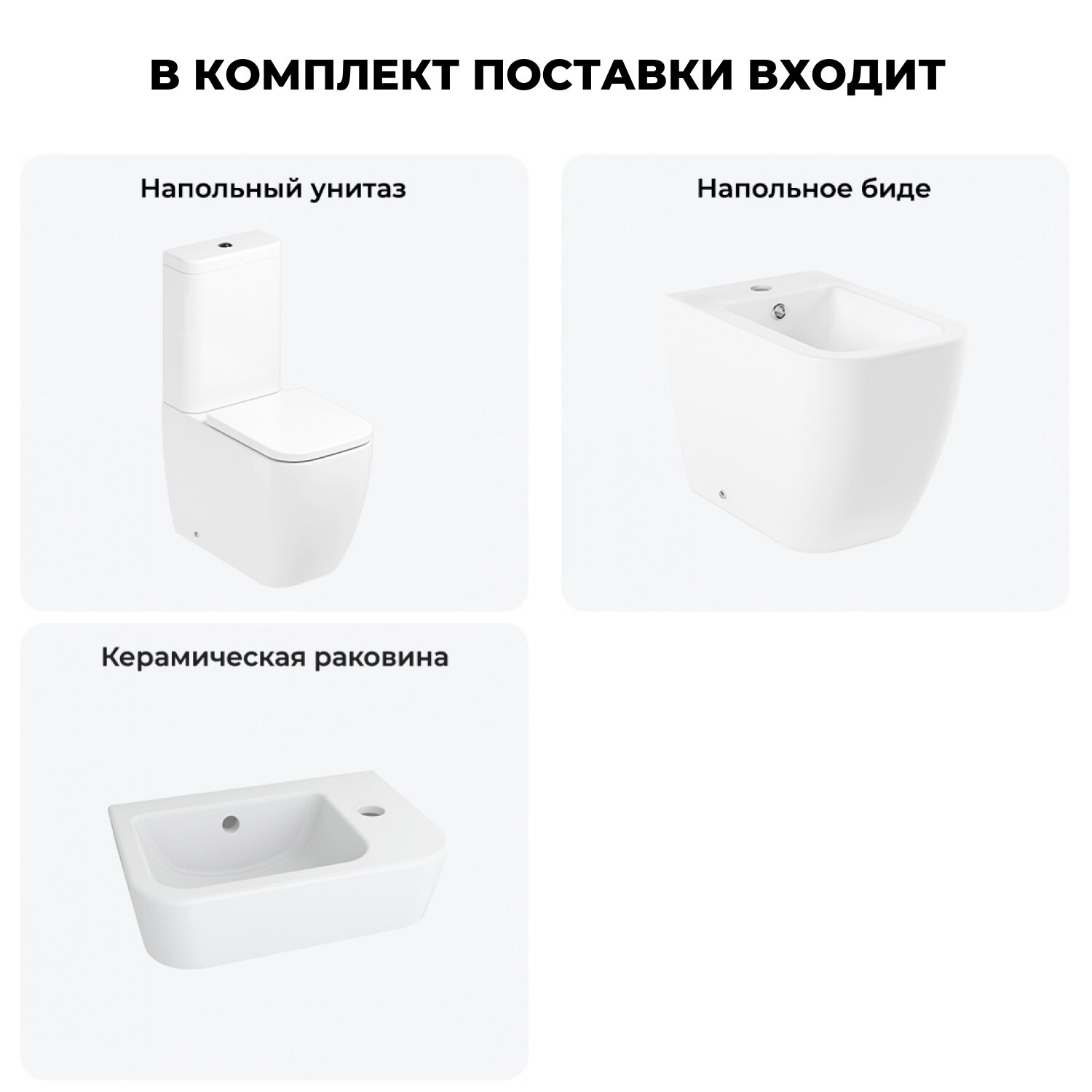 | Дополнительная информация | В набор входит:напольный унитаз; напольное биде, подвесная раковина |