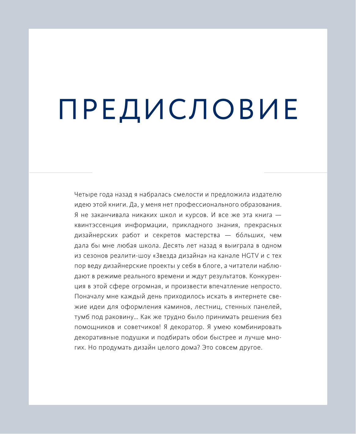 Немного освежить квартиру или изменить интерьер полностью - чего бы вы ни хотели, Эмили Хендерсон, автор книги-бестселлера "Стиль", поможет. Она расскажет все, что сама знает об оформлении и декорировании пространств. Новая книга ответит на все ваши вопросы: от выбора материалов для межкомнатных дверей до удобной планировки кухонного гарнитура, от подбора мебели до приемов быстрого обновления наскучившего декора. Эмили поделится правилами дизайна интерьеров, которые помогут вам воплотить дом своей мечты в реальность и быть уверенными в своих силах.Для кого эта книгаДля всех, кто хочет освежить и обновить свой дом, кто ищет красоты и вдохновения для оформления собственного жилья.От автораВаш дом - тот, что родился у вас в воображении, - уникален, его никто еще не создавал. Здесь не существует шаблонов. Знайте правила, но не следуйте им слепо. Первая часть книги поможет освоить язык профессионалов, если вы не готовы справляться сами. Мы рассмотрим элементы интерьера: от окон и полов до освещения. Во второй части мы обсудим все комнаты в доме и поговорим не только о том, как их "следует" оформлять, но и о том, как нарушить правила (иногда это необходимо). На каждой странице вы найдете работы известных, востребованных дизайнеров. Кое-где встречаются и фотографии моих проектов. Надеюсь, они вас вдохновят.Моя цель - помочь вам создать дом как от лучшего дизайнера. Потому что вы и есть лучший дизайнер для самого себя.