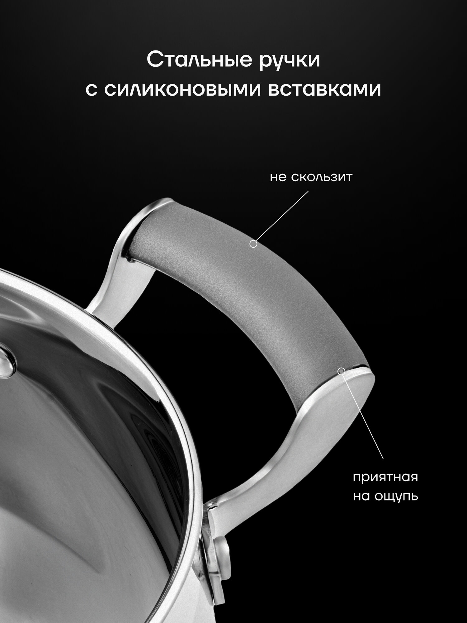 Удобные стальные ручки с силиконовыми вставками не скользят и не обжигают руки.
