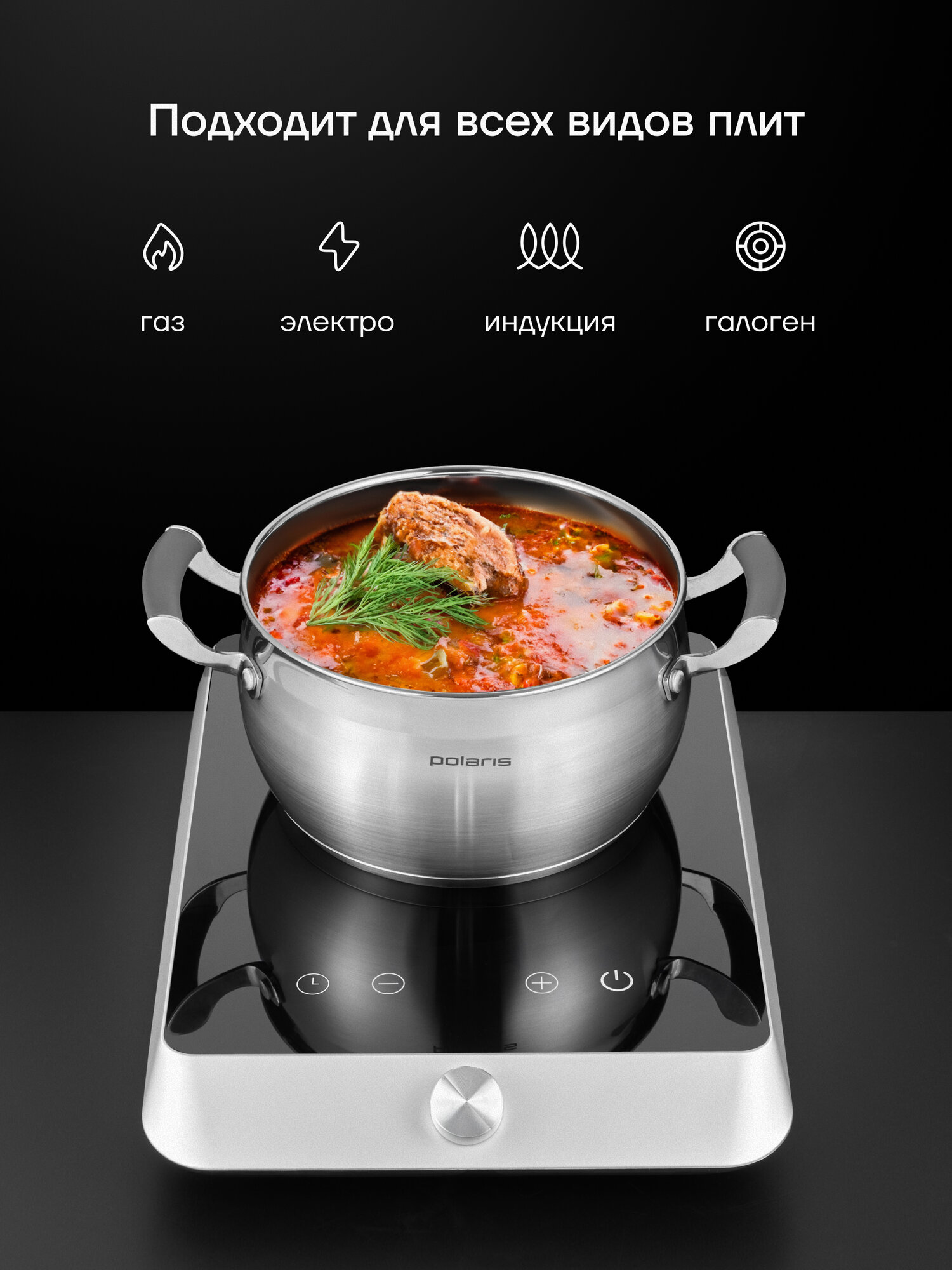 Подходит для всех типов плит, включая индукцию. Для надёжной работы посуды Polaris на вашей индукционной плите, обязательно уточните в инструкции к плите минимальный допустимый диаметр дна посуды для каждой конфорки.