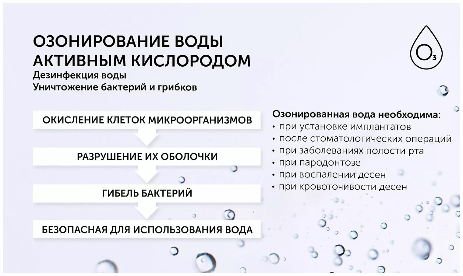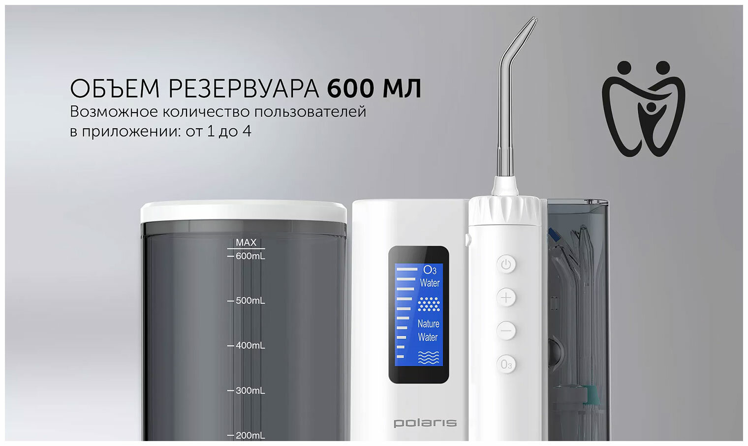 Стационарный ирригатор для всей семьи с функцией озонирования воды. Чистка межзубных промежутков, удаление налета напором воды в дополнение к зубной щетке, соблюдение гигиены при наличии имплантов, брекетов, коронок, мостов, для оздоровления десен с помощью массажа. Озонирование воды: дополнительная дезинфекция воды, способствует снятию воспаления с десен