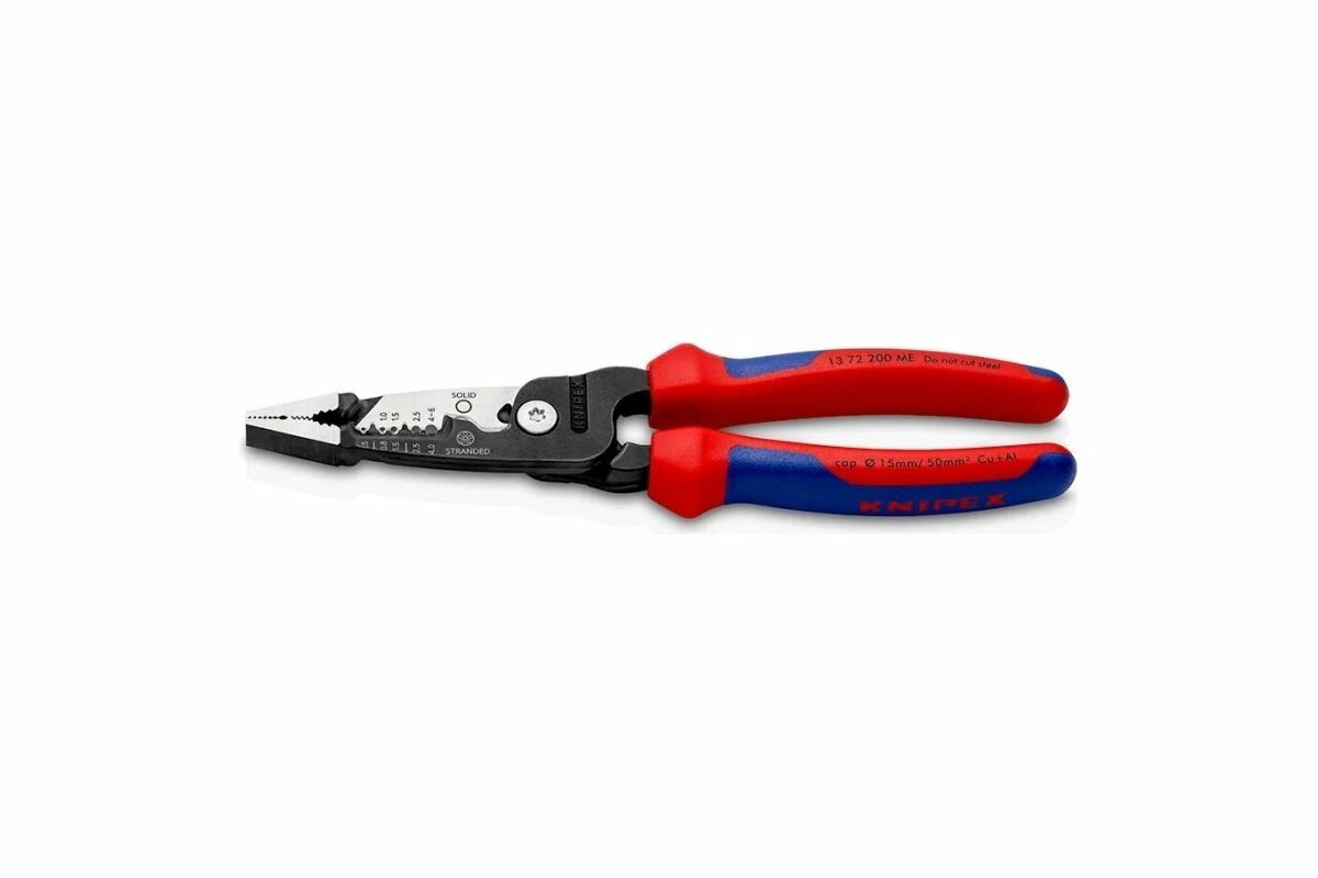 KNIPEX 13 72 200 ME WireStripper Многофункциональные плоскогубцы для электрика, метрическая версия с многокомпонентными рукоятками, фосфатирование, 200 мм. Продуманная зачистка: большой диапазон производительности, четкие профили зачистки и интуитивно понятное позиционирование. Инновационная геометрия резки: более легкая резка, особенно плоских кабелей. Гибридная конструкция: плоская, как плоскогубцы, широкая, как комбинированные плоскогубцы, для высокой стабильности и хорошей доступности. Выпуклая поверхность захвата, с одной стороны, для надежного захвата плоского материала и зона захвата для круглого материала. Простая резка медных и алюминиевых кабелей до 15мм (1/2"). Фрезерованный паз для надежного удержания и вытягивания мелких деталей, например гвоздей. Наружные кромки для снятия заусенцев с труб. Точное позиционирование провода благодаря наличию гребней. Точные шлифованные зачистные профили для одножильных проводников сечением 0.75-6кв.мм и тонкостенных проводников сечением 0.5-4кв.мм. Широкие захватные поверхности, с поперечными насечками, для скручивания проводов