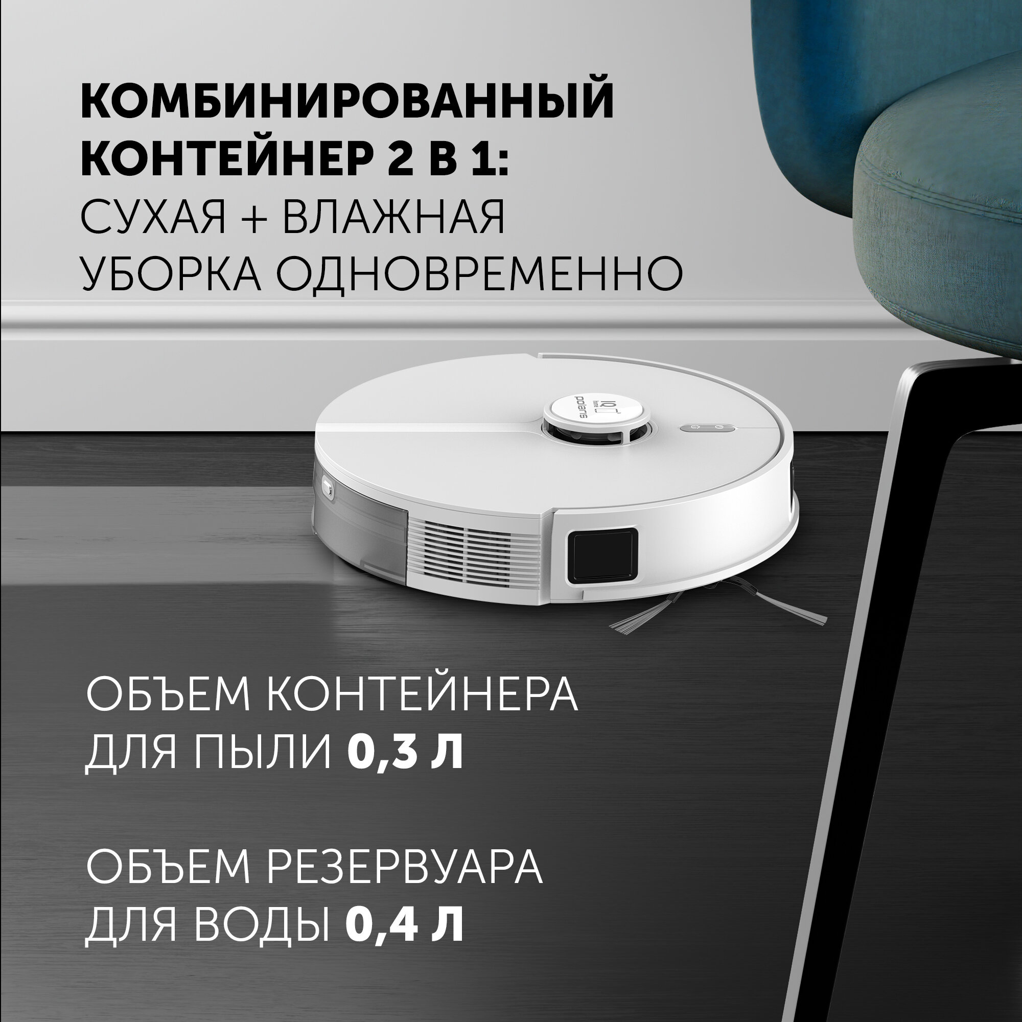 Создан для сухой и влажной уборки. Благодаря лидару легко ориентируется в пространстве и строит подробную карту помещения. Технология Dual laser позволяет обнаружить препятствия на уровне пола и избежать столкновения с мелкими предметами или наматывания проводов. Управлять режимами и контролировать уборку дистанционно удобно в приложении IQ Home.