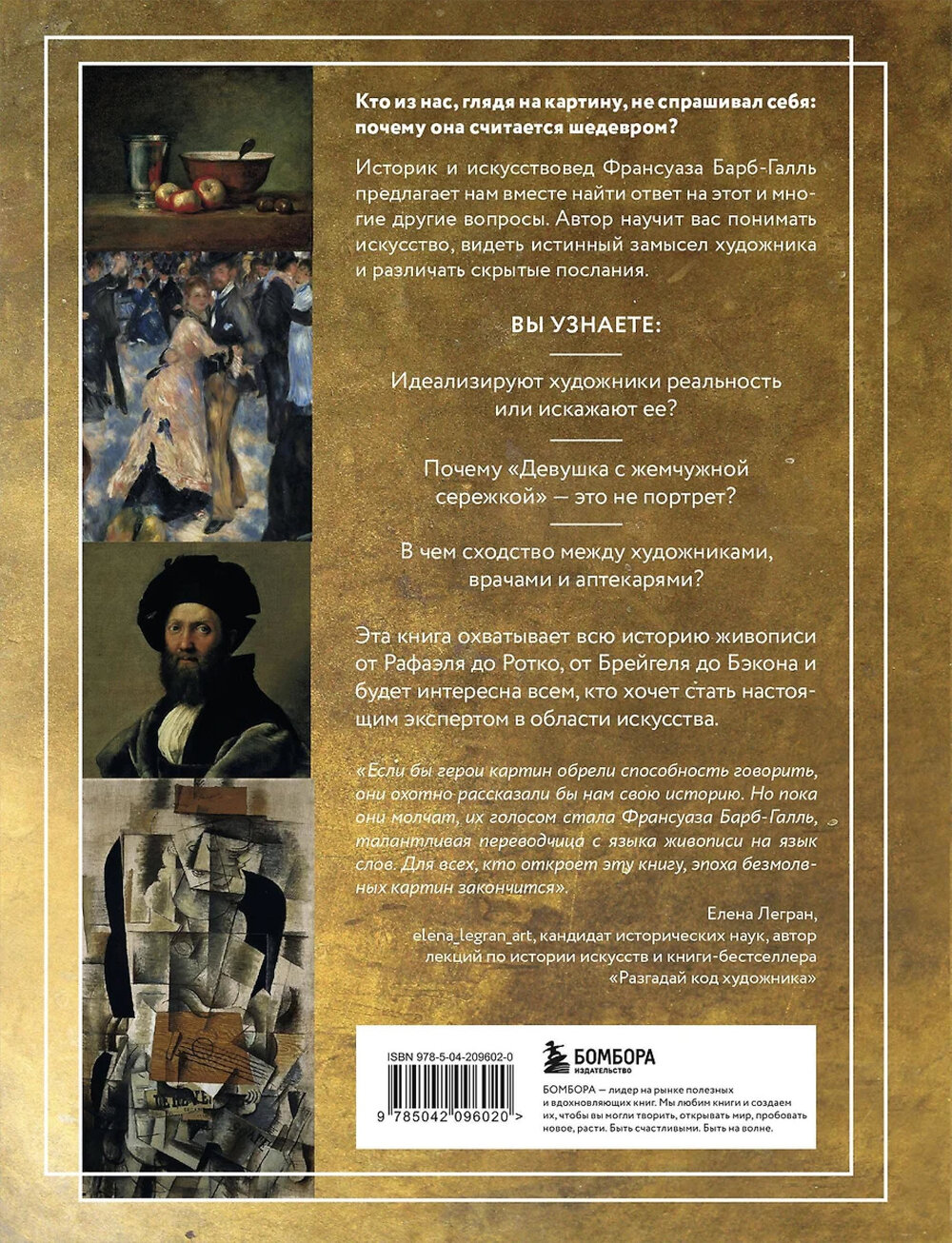 Переиздание бестселлера Франсуазы Барб-Галль, искусствоведа, преподавателя Школы Лувра. В нем автор предлагает расшифровать то, что хотел сказать художник, и научиться понимать живопись. Для этого нужно внимательно изучить картину, довериться своим глазам и своим ощущениям. В этой книге подробно разбираются шедевры мировой живописи, среди которых «Весна» Боттичелли, «Мулен де ла Галет» Ренуара, «Постоянство памяти» Дали, «Крик» Мунка, «Мадонна с младенцем и святой Анной» Да Винчи.