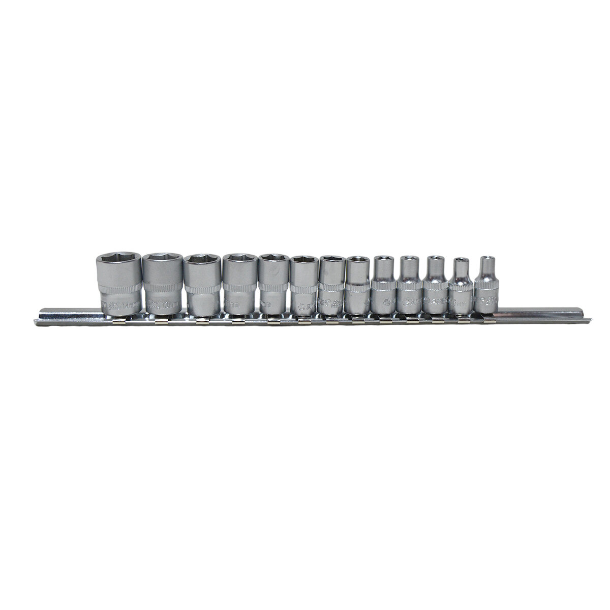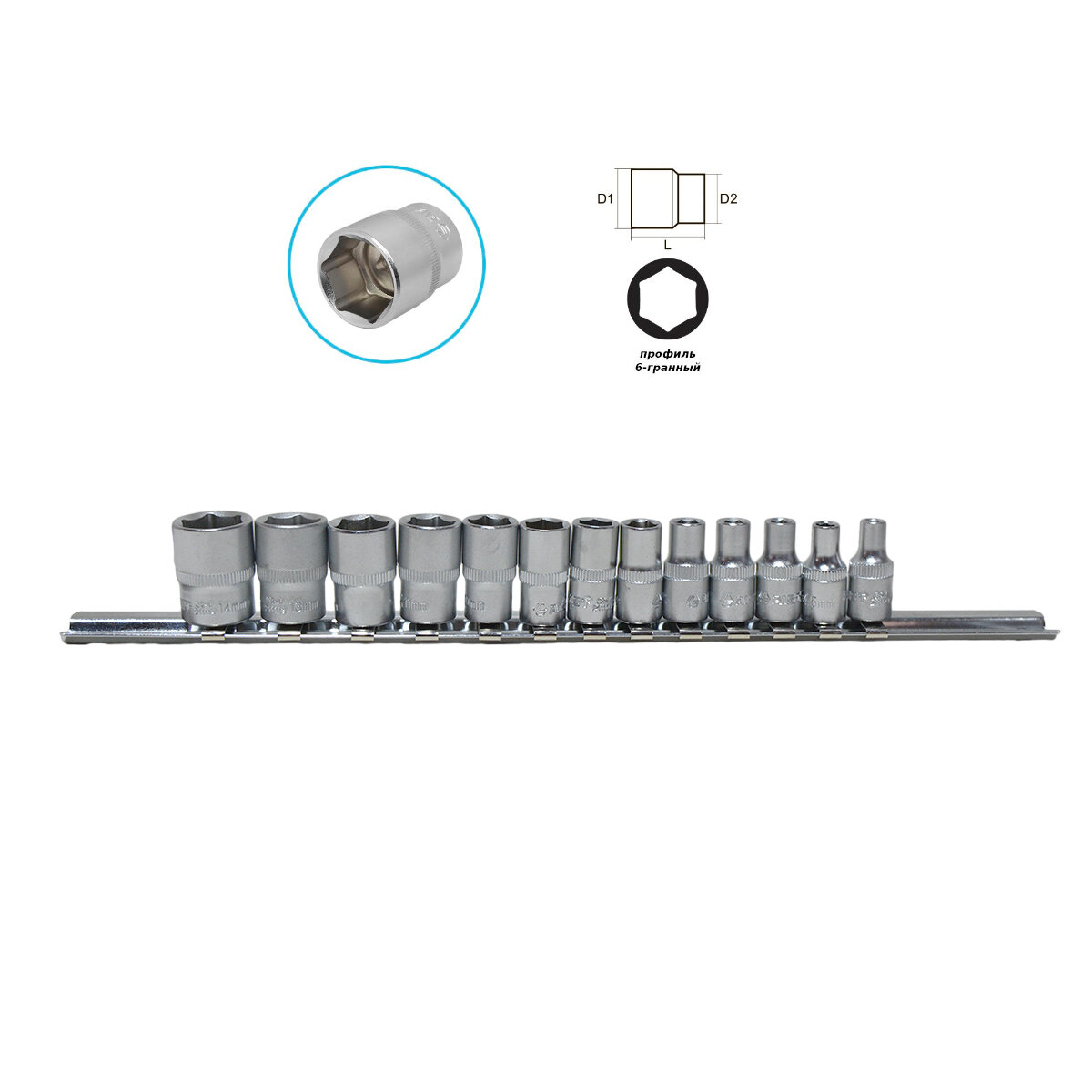Набор сменных торцевых головок 1/4" дюйма 6-гранных 4-14 мм 13 предметов на металлической планке используется для взаимодействия с резьбовыми соединениями шестигранного профиля. Набор шестигранных головок 1/4" включает непрерывный ряд головок размером от 4 мм до 14 мм. Для использования набора маленьких сменных головок 1/4" потребуется наличие воротка или трещотки с присоединительным квадратом 1/4" дюйма. Набор головок под маленькую трещетку или вороток.Материалы и технологический процесс изготовления:- сталь: хромованадиевая Cr-V 50BV30;- обработка: полирование, закалка ТВЧ;- покрытие: трехслойное хромоникелевое сатиновое;- твердость: 42-46 HRC.Конфигурация:- 6-гр. динамический профиль;- посадочный квадрат 1/4" (6.35мм) с динамическим профилем;- накатка по окружности.Комплектация:1/4" Головка 6-гр: 4, 4.5, 5, 5.5, 6, 7, 8, 9, 10, 11, 12, 13, 14 мм - 13 шт.Прочее:- на металлической планке держателе (рельсе).